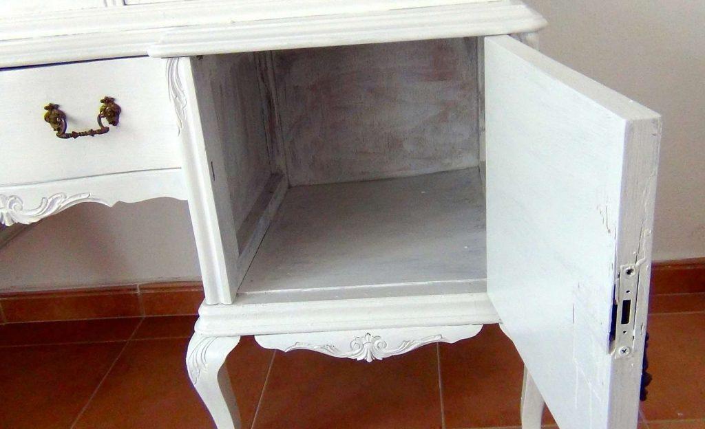 Cuando fui a recogerla, a primera vista no sabía qué hacer con ella, pues estaba bastante deteriorada, una pata rota, una de las puertas de bajo destrozada, pero lo peor, eran los mil agujeros que tenía debido a la carcoma. Al final si se pone empeño, todo puede resultar como uno imagina en un principio. Además como siempre digo, tengo la suerte de contar con mi marido, que es un manitas y entre los dos van saliendo las cosas.