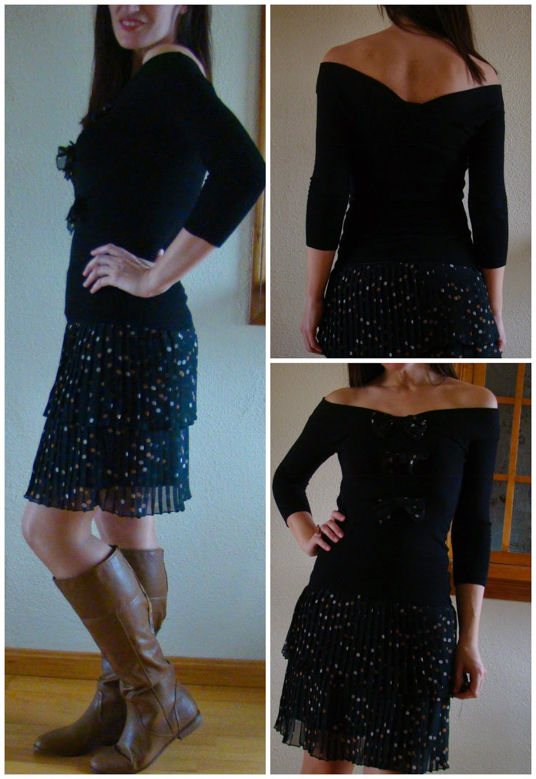 Con todo esto y un jersey de cuello barco de hace casi diez años, que lo tenía en el fondo del armario, o del olvido, se me ocurrió que con unos lazos en la parte delantera ya había resuelto el gran problema...