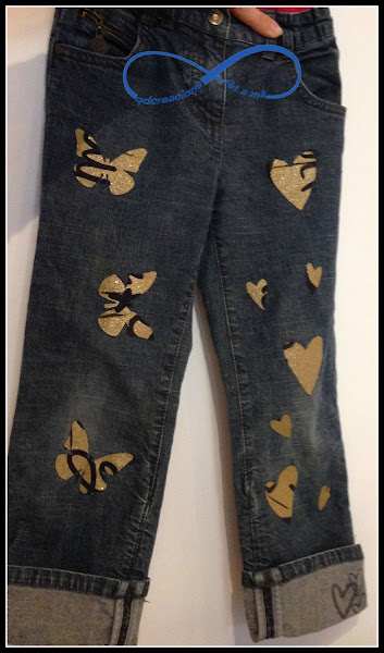 Este fue el pantalón al que le añadí unas mariposas y corazones troquelados y pegados con pegamento textil.