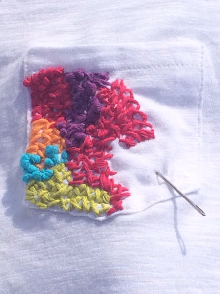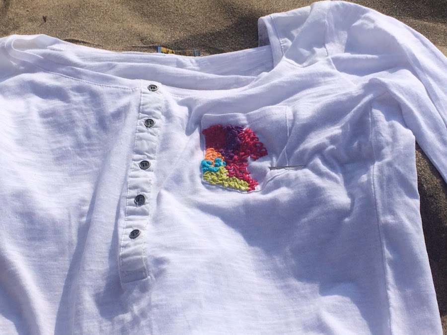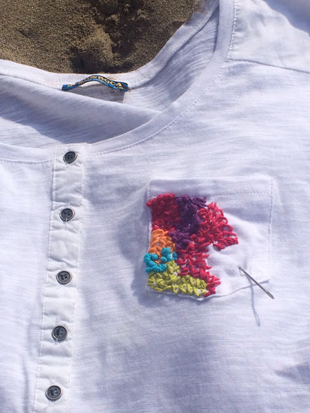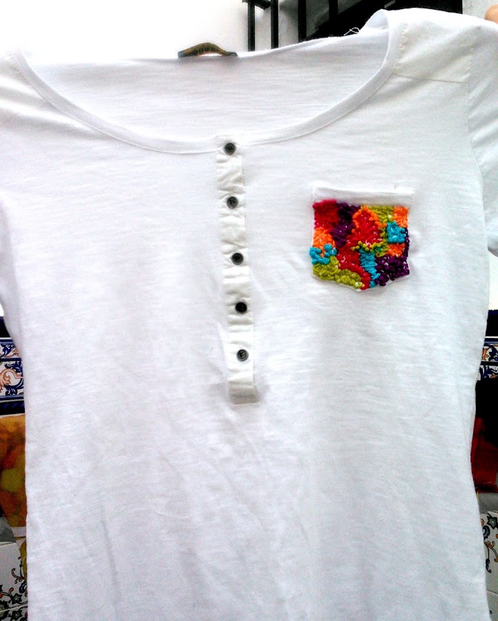 Hoy traigo una nueva idea para customizar una camiseta.Es muy simple y en este caso le he bordado únicamente el bolsillo con hilo de muchos colores y de forma aleatoria, sin seguir un patrón concreto, lo que está de moda ahora y es conocido como Freefrom. En este caso he usado los hilos de DMC Natura cotton que me resultan muy suaves, aunque son para crochet, a mi me encantan para este tipo de bordado.