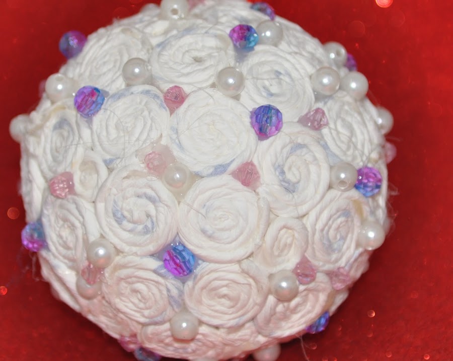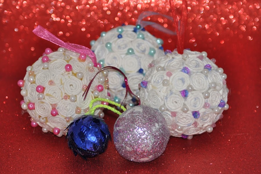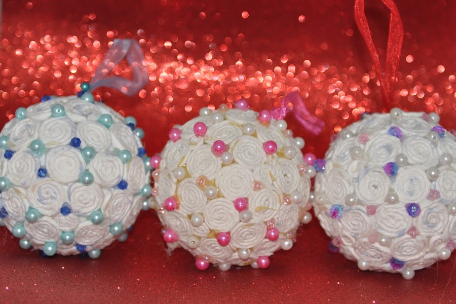 Estas están hechas con la bola de poliespán grande.Por otra parte se hacen caracolas con el papel de cocina,después se pegan con silicona (térmica en mi caso).Entre los huequitos que quedan entre las "caracolas" de papel se pegan los adornos que más nos guste.