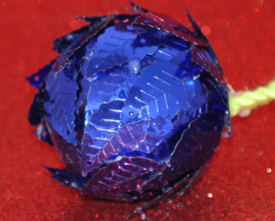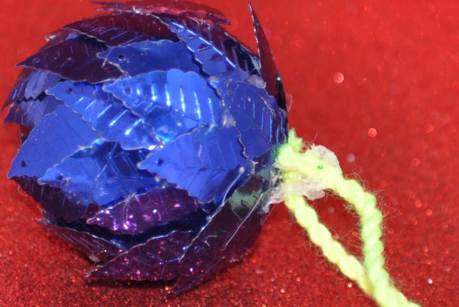 A una bola más pequeña que las anteriores,pegamos el adorno que queramos con silicona.En este caso son una especie de hojas azúles,y se van pegando hasta que la cubrimos por completo.