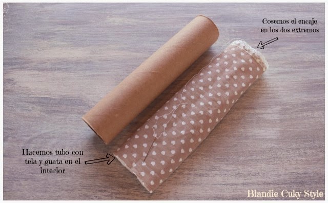 Como se explica en la foto anterior, hacemos el tubo con la tela pegando la guata por la parte interior para que luego podamos pinchar cosas, por ejemplo broches. Si no tenemos guata no pasa nada, quedará más o menos igual. Luego añadimos encaje en los extremos. Si no tenemos encaje tampoco pasa nada, pon cualquier otro material que quede bonito.