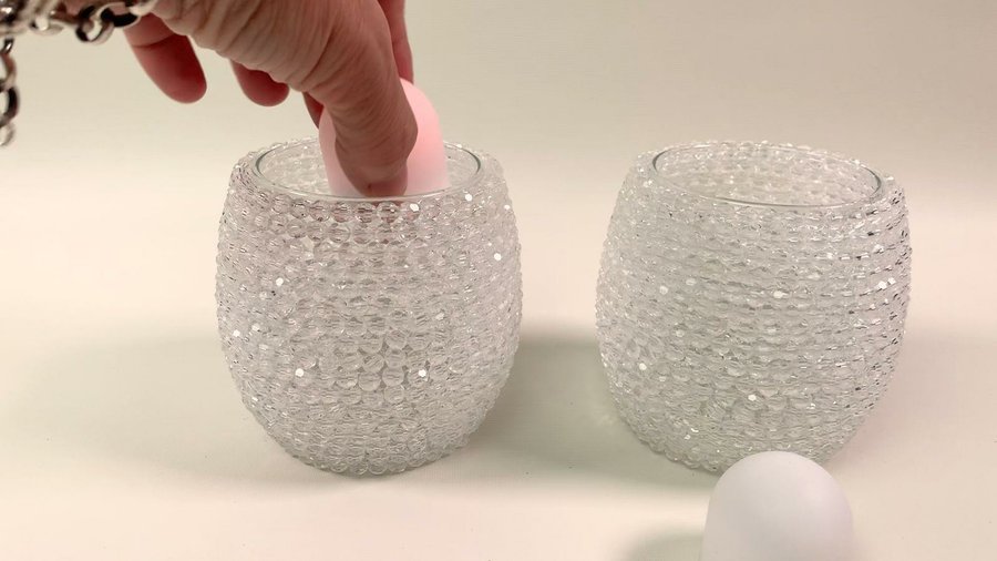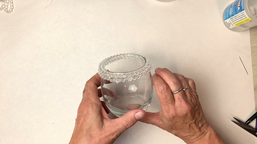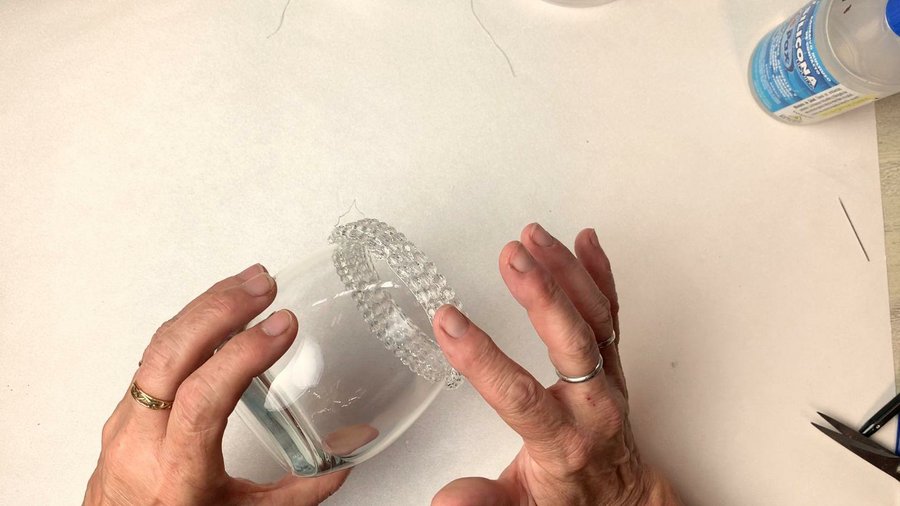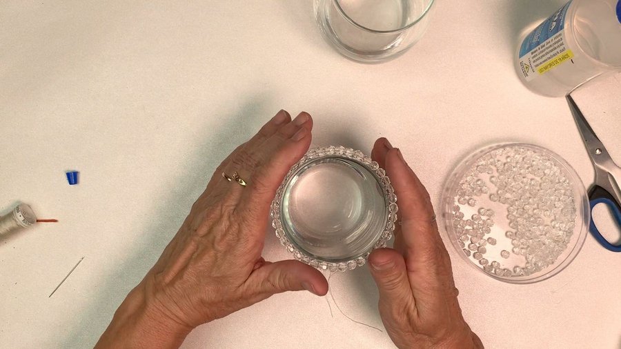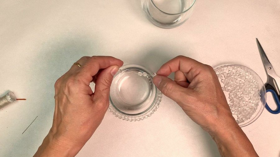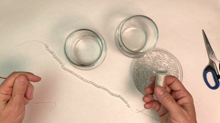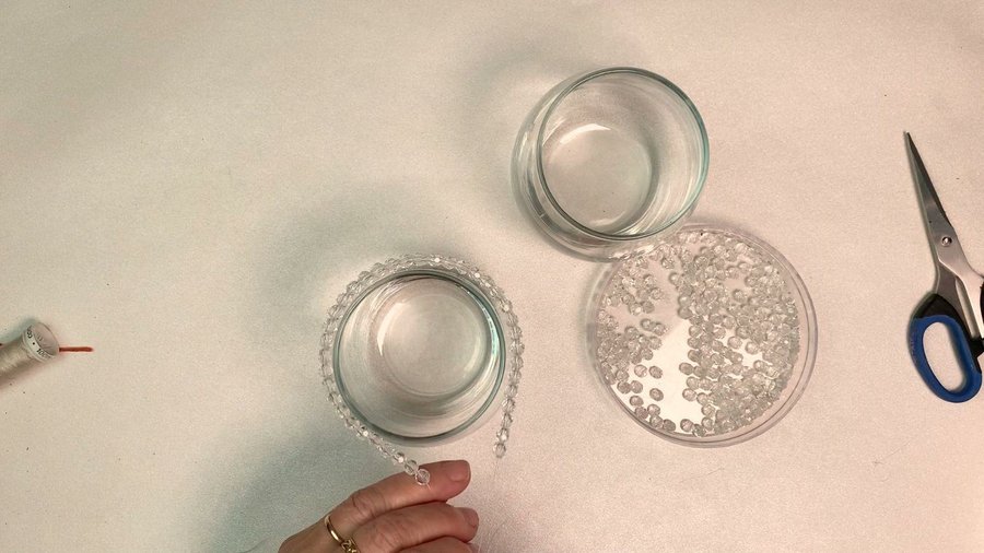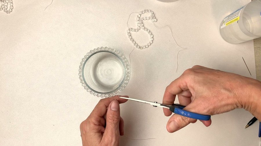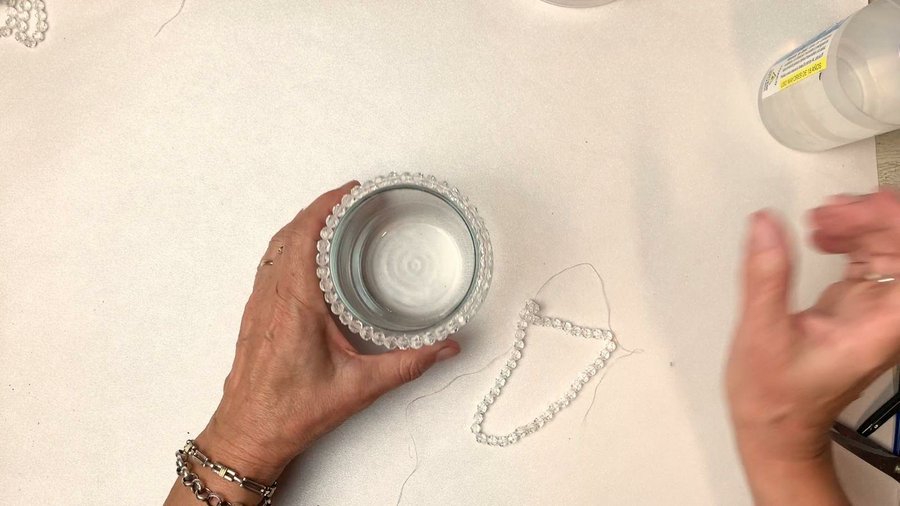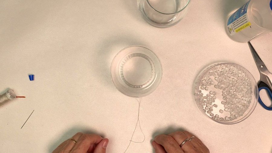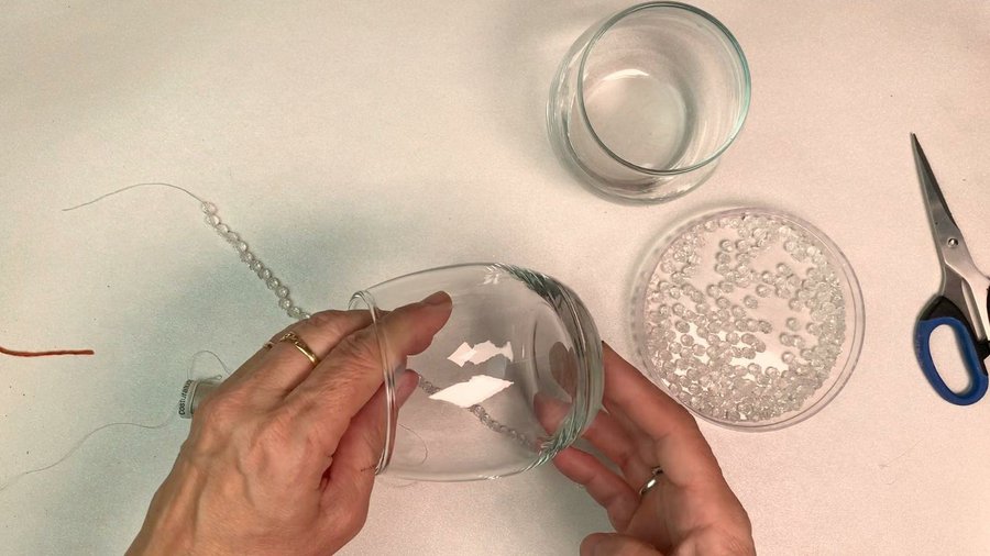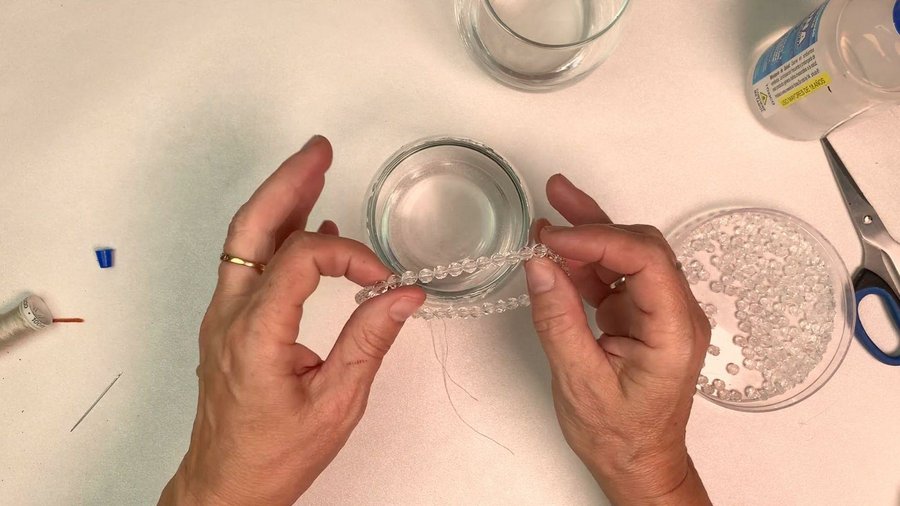 Luego se enhebran las perlas con la aguja y se hace una cadena que tenga el tamaño justo de la boca del recipiente. Unimos la cadena y medimos que esté correcta.