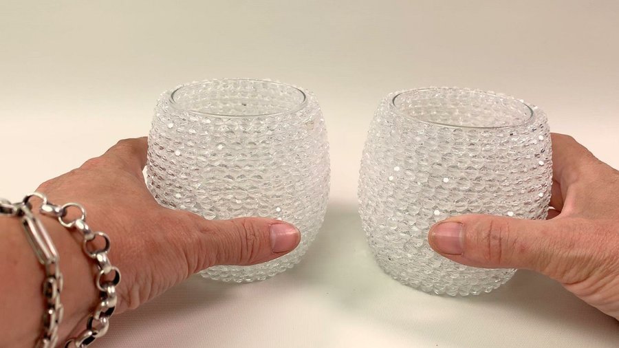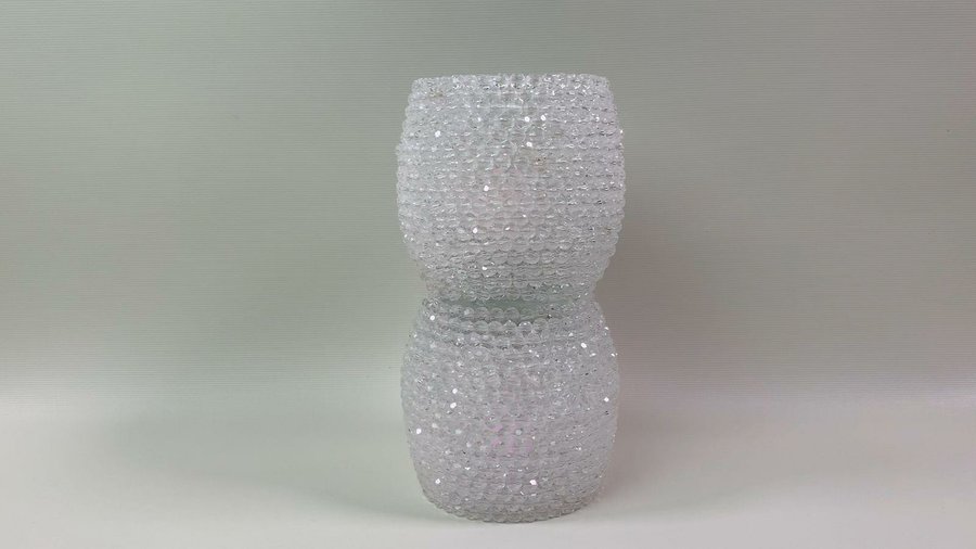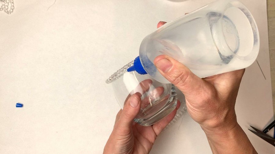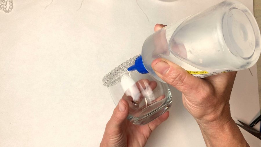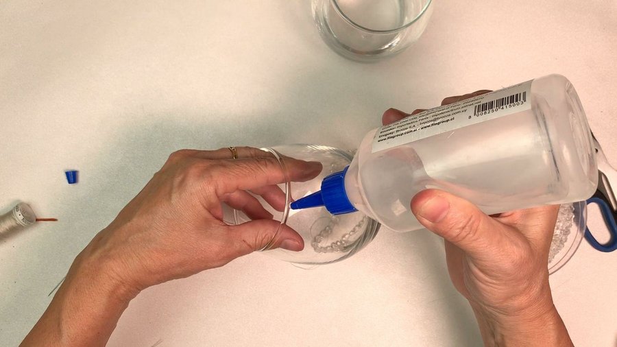 Y se pega y se deja secar . Y así sucesivamente cadena tras cadena hasta completar todo el envase de vidrio.