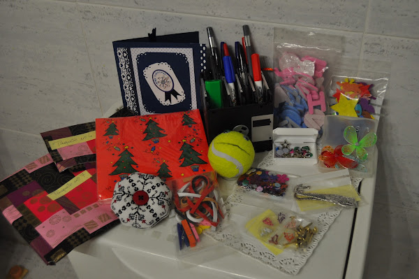 Después tambien participé en el foro de Fantasias y sueños y aquí me tocó de as a eleni73 que no conocía muy bien pero por las webs que pude ver que visitaba le envie unas telas para que hiciese cosillas de costura y la siguiente tarjeta: