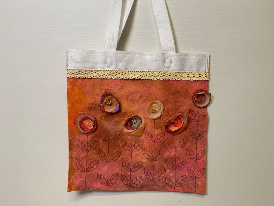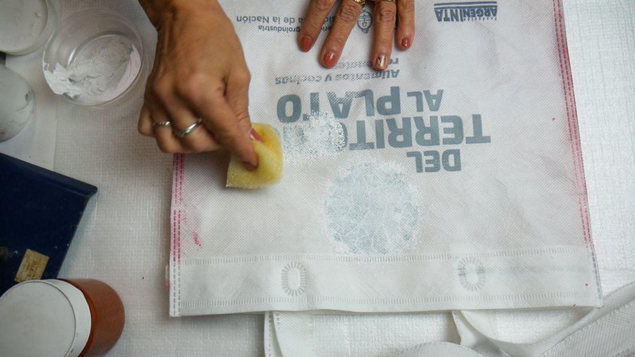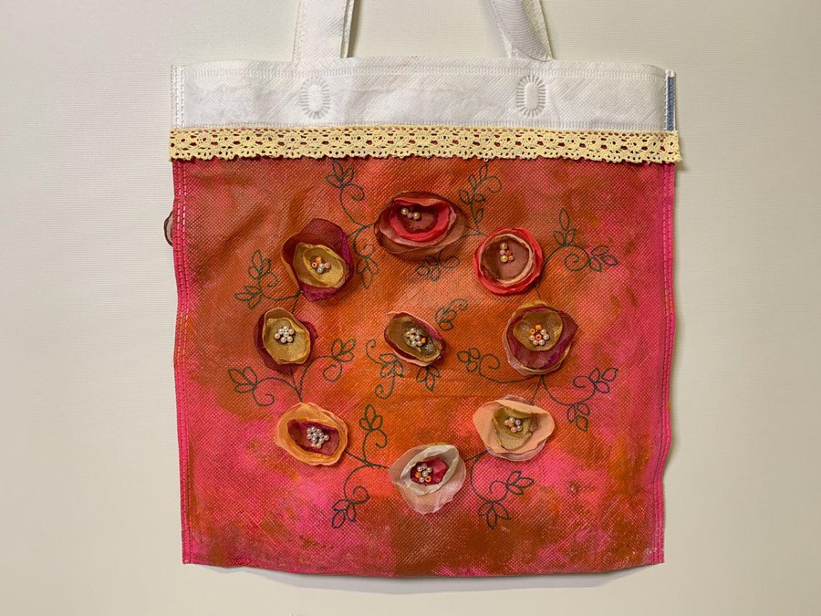 El primer Diseño la llamé PRIMAVERA., utilicé una bolsa blanca con letras celestes a la que voy a pintar.