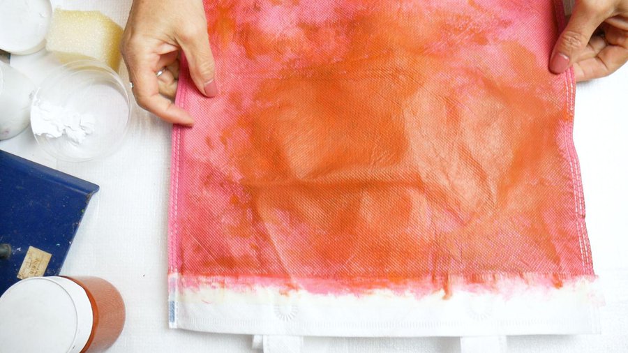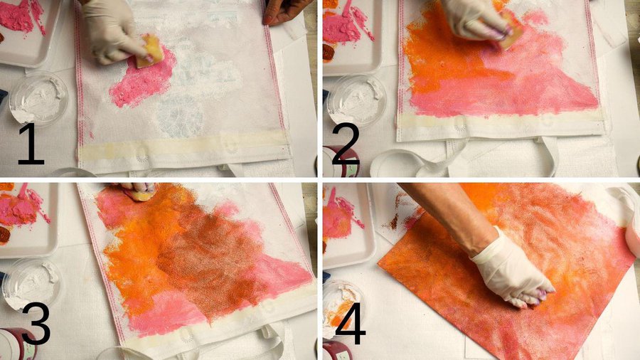 Emplee los mismos colores rosa, siena calcinada y amarillo oro, con la esponja a través de golpecitos intercalando así los colores.