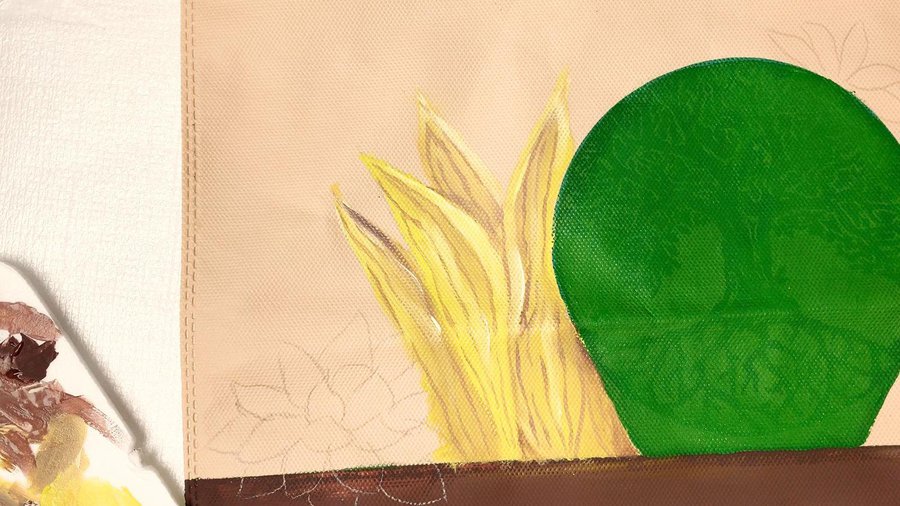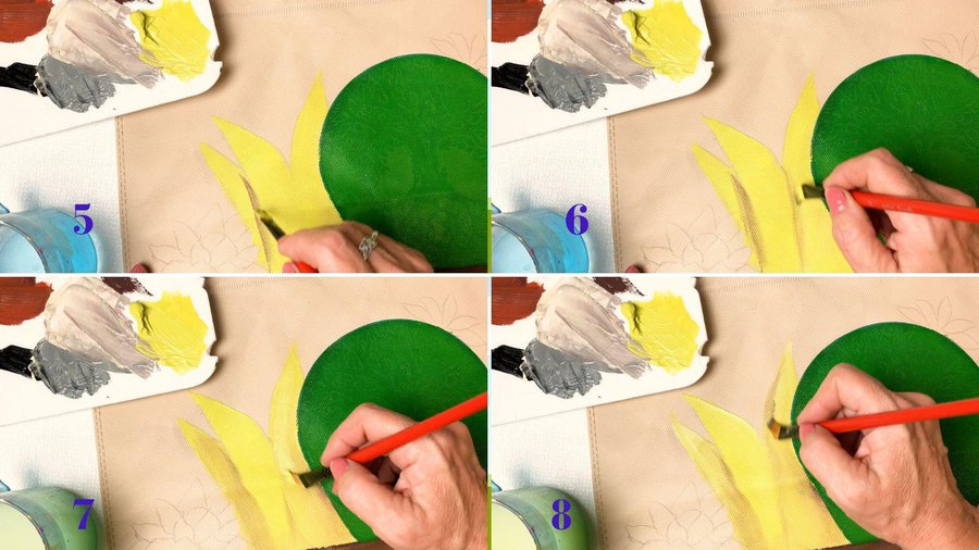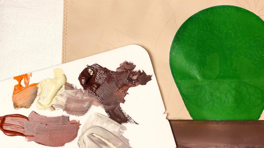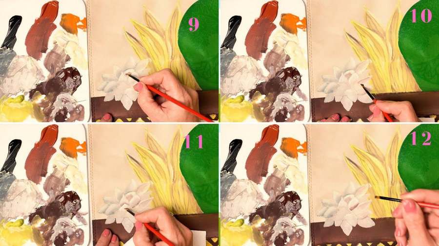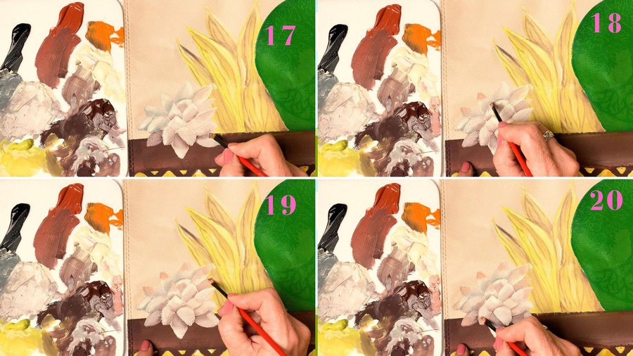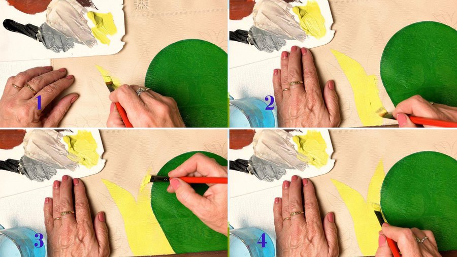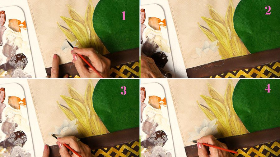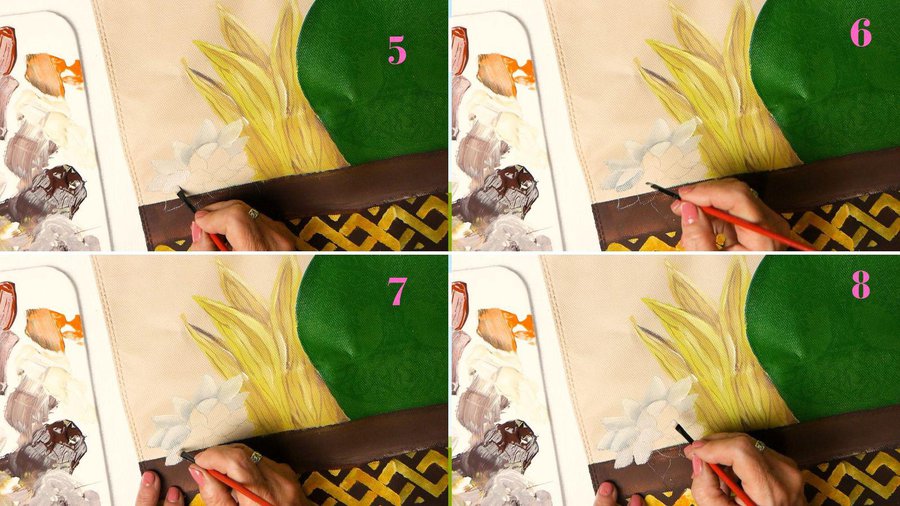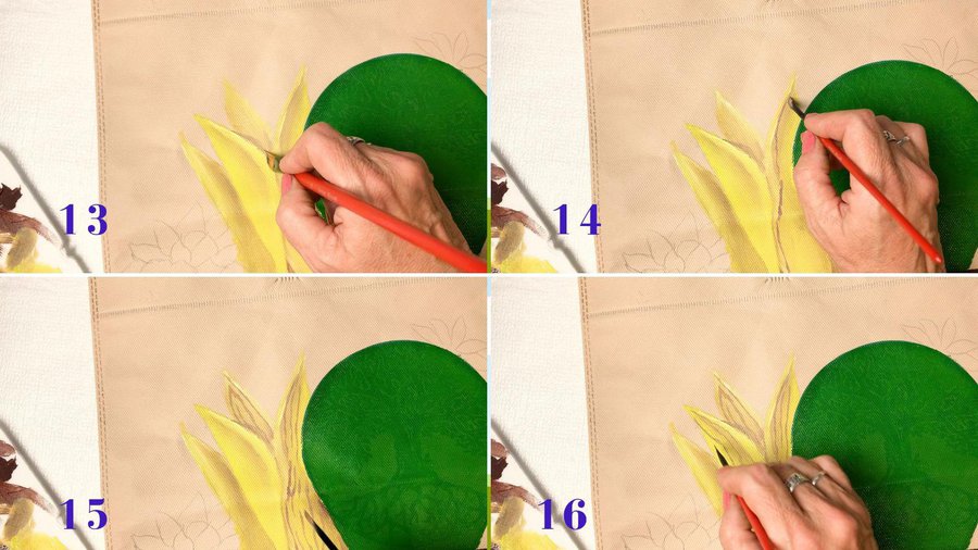 Pueden emplear pinturas acrílicas, pinturas a la tiza, pinturas látex o pintura para telas. La separación entre las hojas se hace con sombras con color chocolate.
