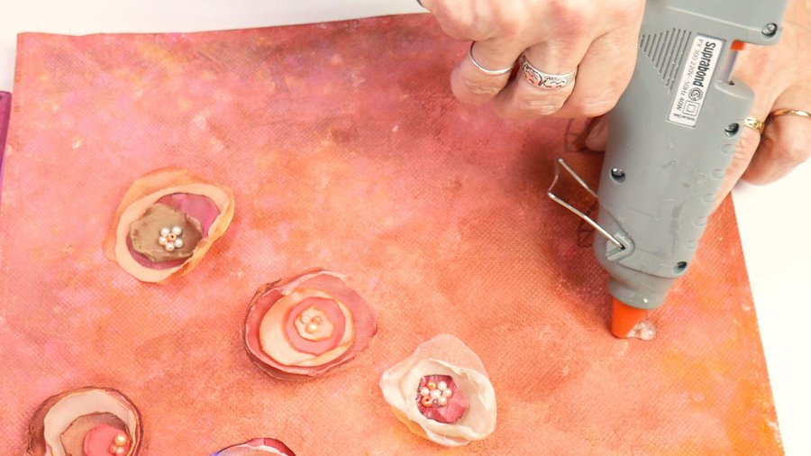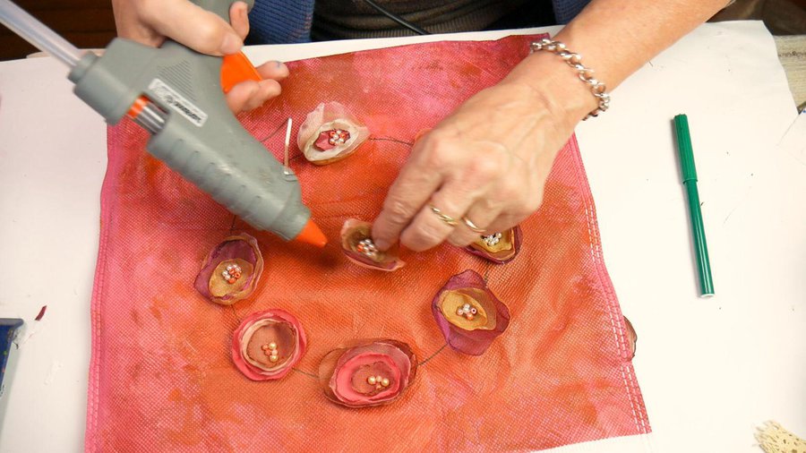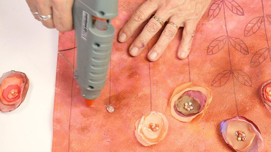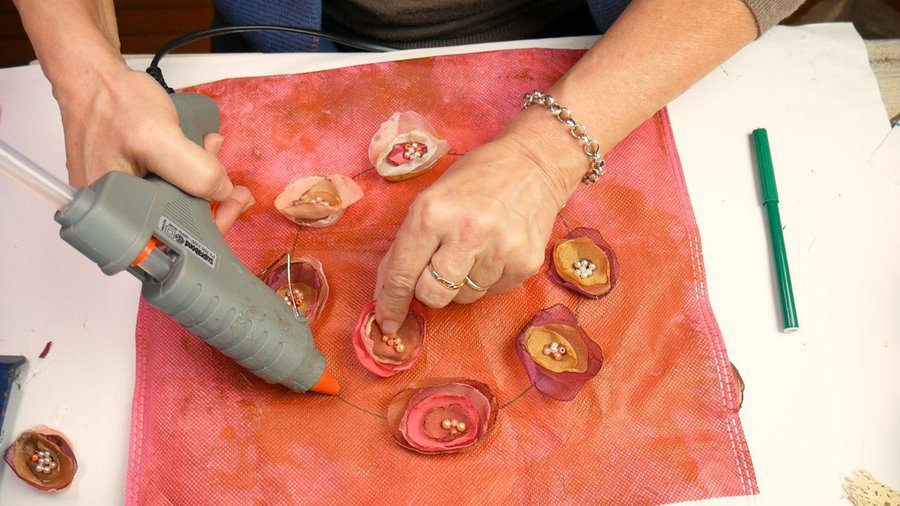 Sobre el final de ésta línea pego una de las flores con la pistola de calor.