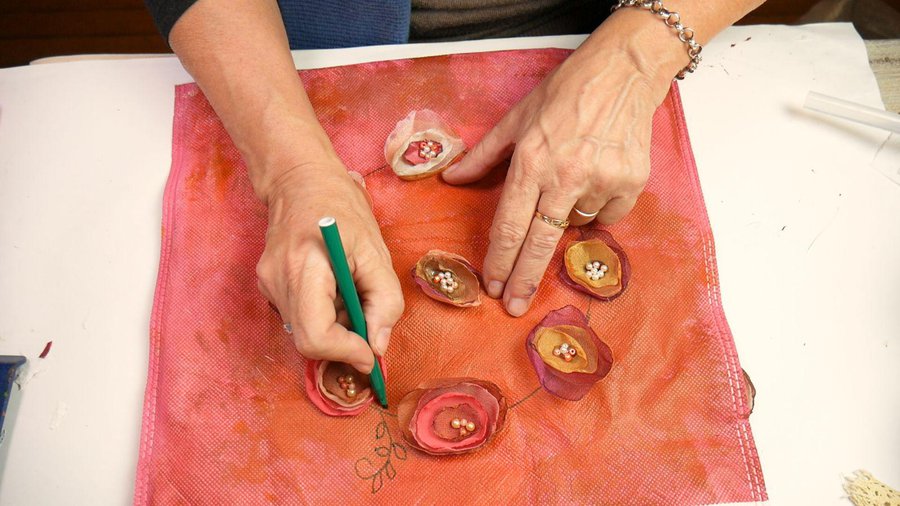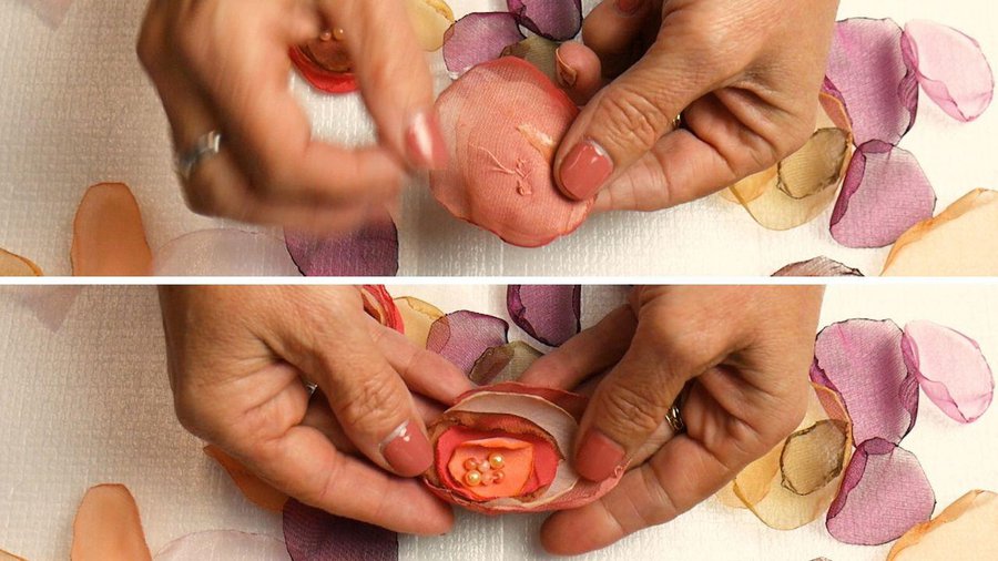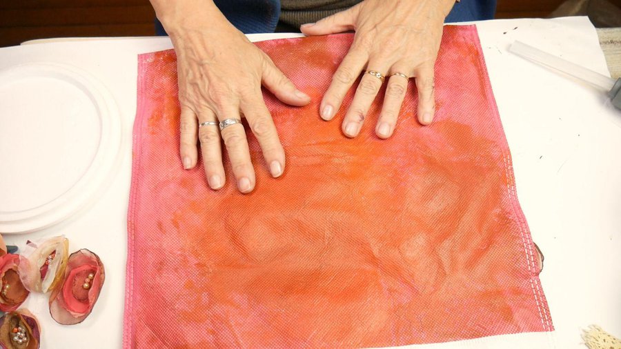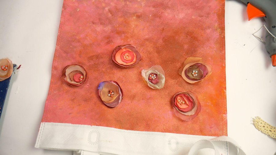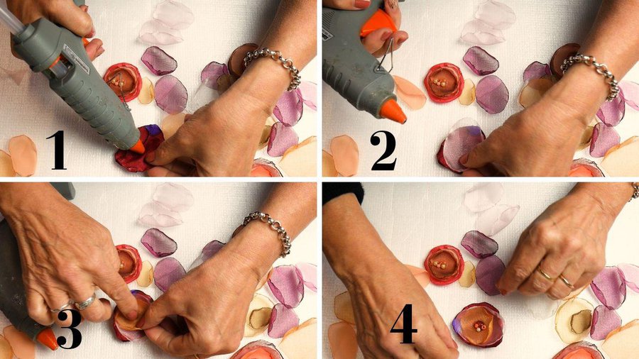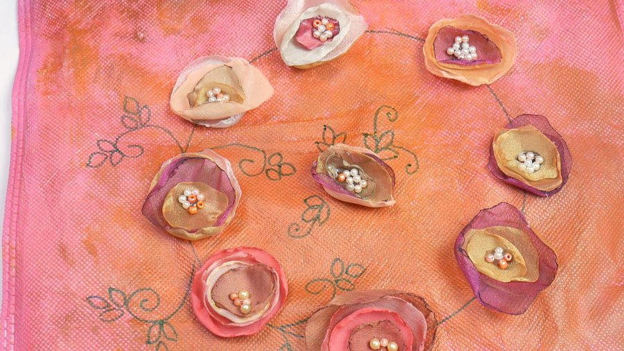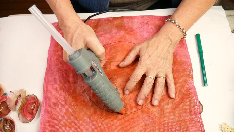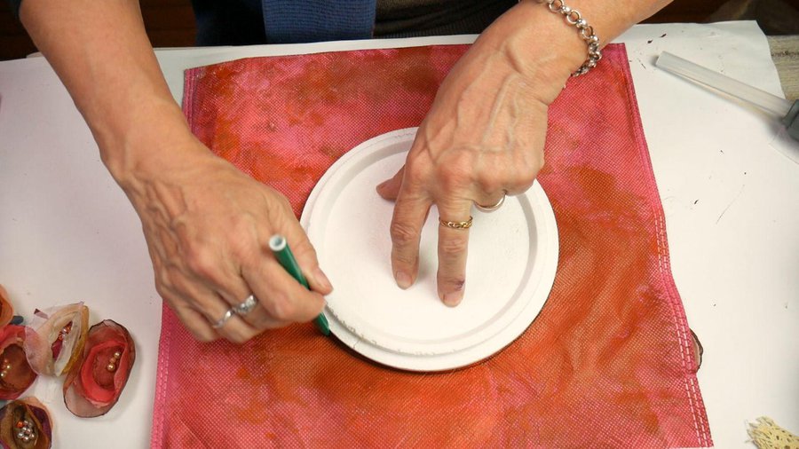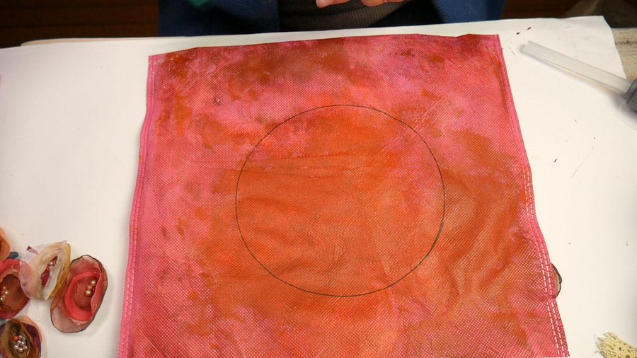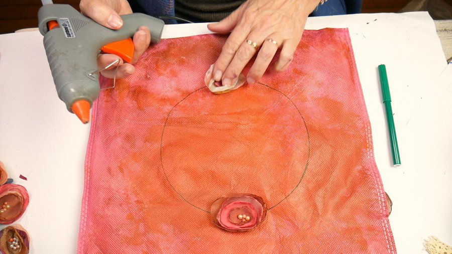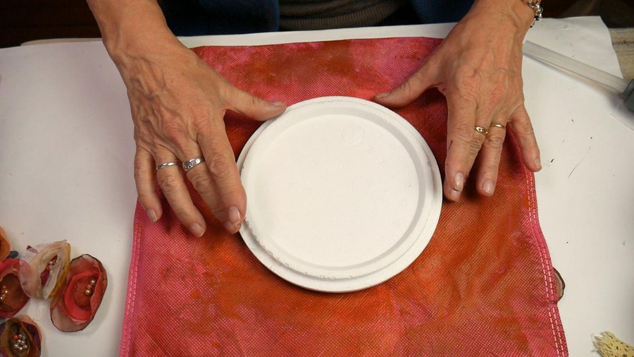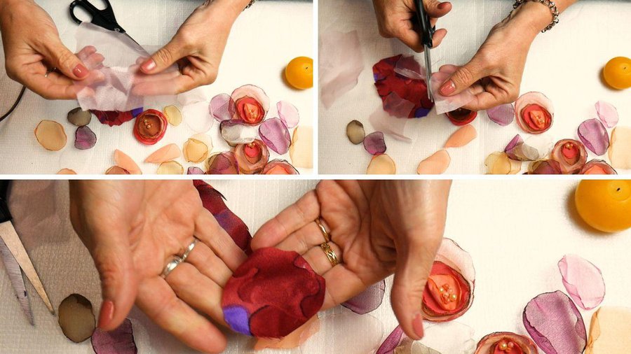 Los apliques que elegí son flores realizadas con tela. Para ello corto un círculo de tela, no muy parejo. La tela puede ser organza, seda, gasa, tul.