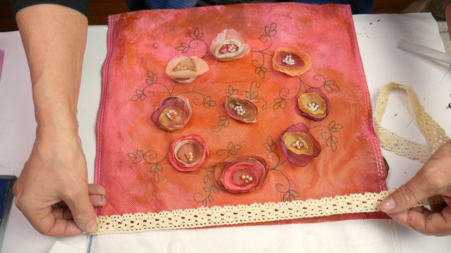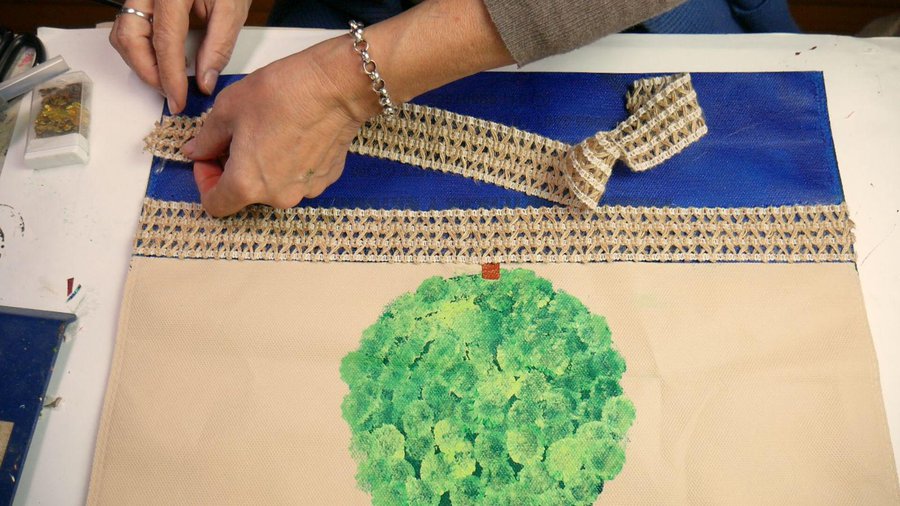Aplico el pegamento en la zona que elegí y sobre el mismo pego esta puntilla. Esto lo hago de los dos lados de la bolsa.