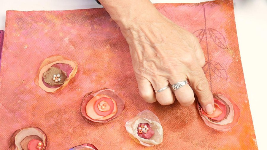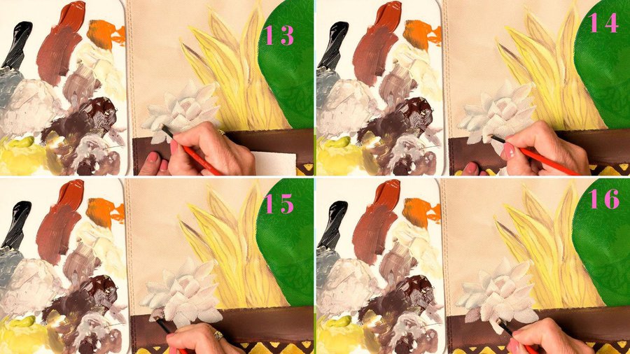 Retoco con mas pintura las flores haciéndoles luces con acrílico beige.
