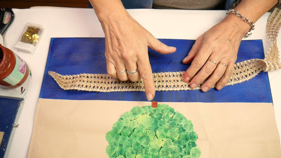 Como terminación final coloco una puntilla en la parte superior, se trata de una puntilla de algodón que voy a pegar con la pistola de calor.