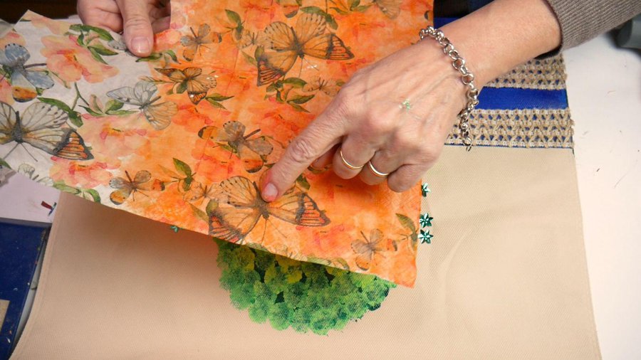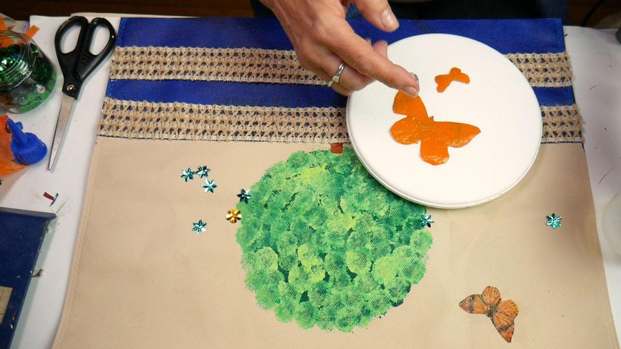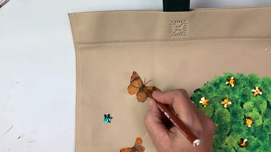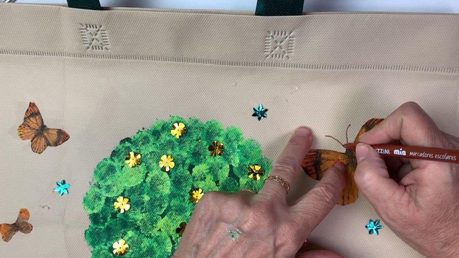 Recorto algunas de las mariposas para pegarlas en la bolsa. Les recomiendo que las peguen con pegamento de silicona ya que con cola vinílica pueden despegarse.