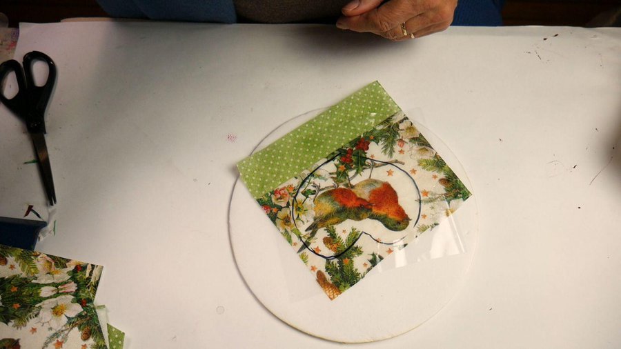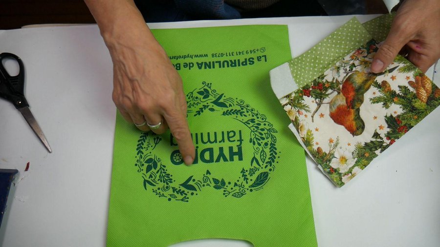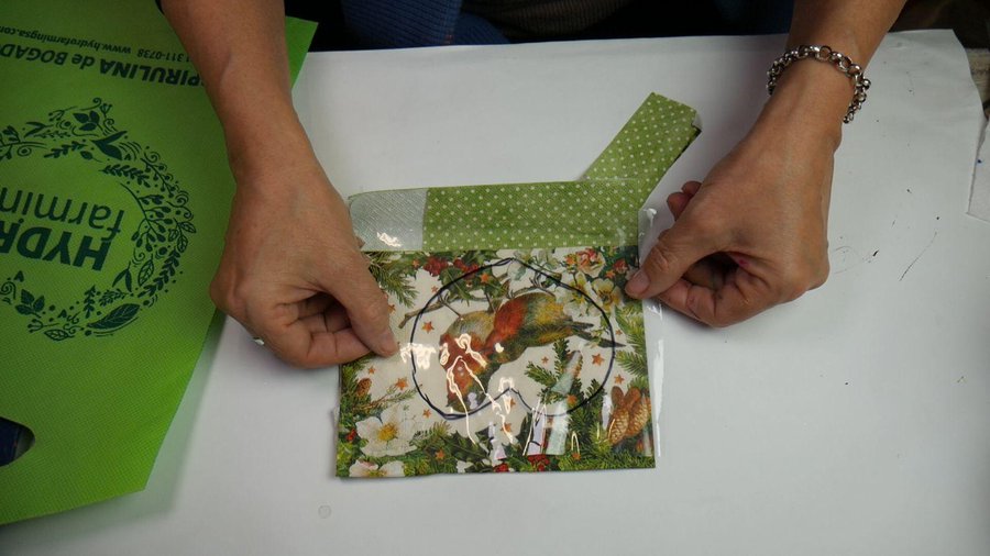 Coloco por encima un trozo de plástico para marcar por donde debo recortar la servilleta.