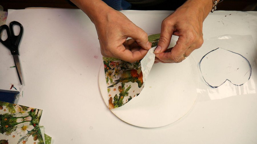 Apoyo este trozo de servilleta sobre la parte blanca del corazón para determinar su posición. Luego con barniz acrílico al agua y un pincel pincelo primero la pintura blanca, apoyo la servilleta y pego con el barniz por encima.