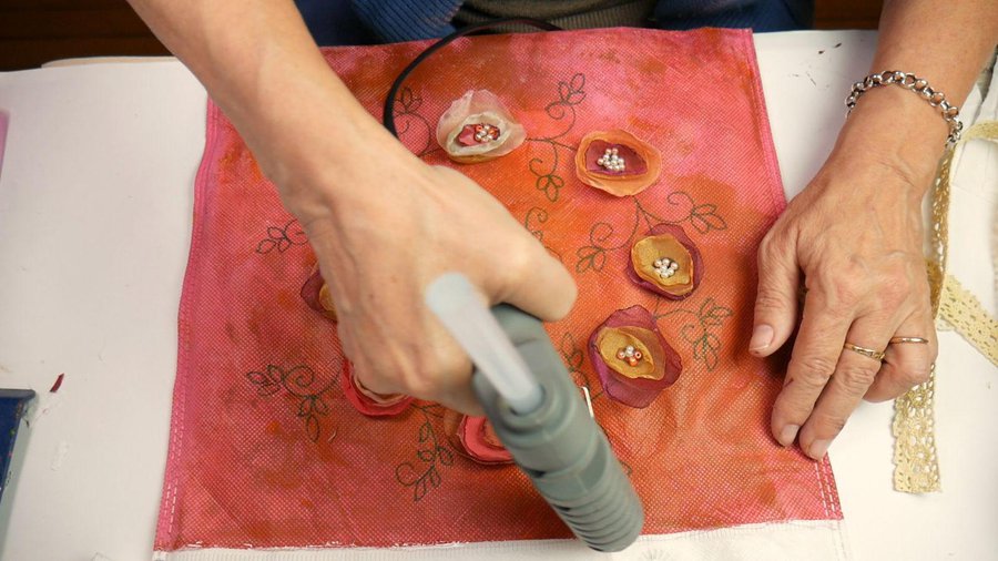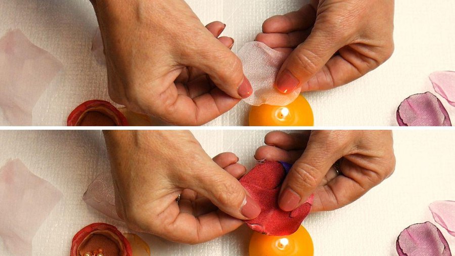 Me acerco a una vela y voy pasando el borde por la llama, con cuidado moviéndola para quemar el borde deshilachado y a su vez se va arqueando hacia adentro lo que parecerá un pétalo de flor. Es un trabajo fácil y rápido, podemos hacer pétalos de varios colores.