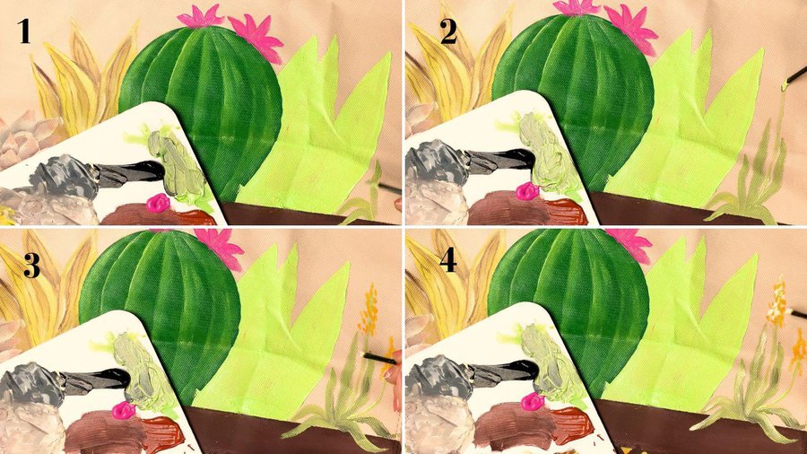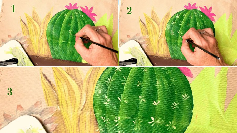 Mientras se secan las hojas vuelvo sobre el cactus y le hago las espinas con un pincel más finito y pintura color beige. Se trata de simples trazos en forma de flor colocados por las divisiones que hice anteriormente.