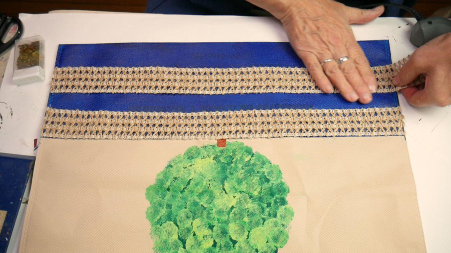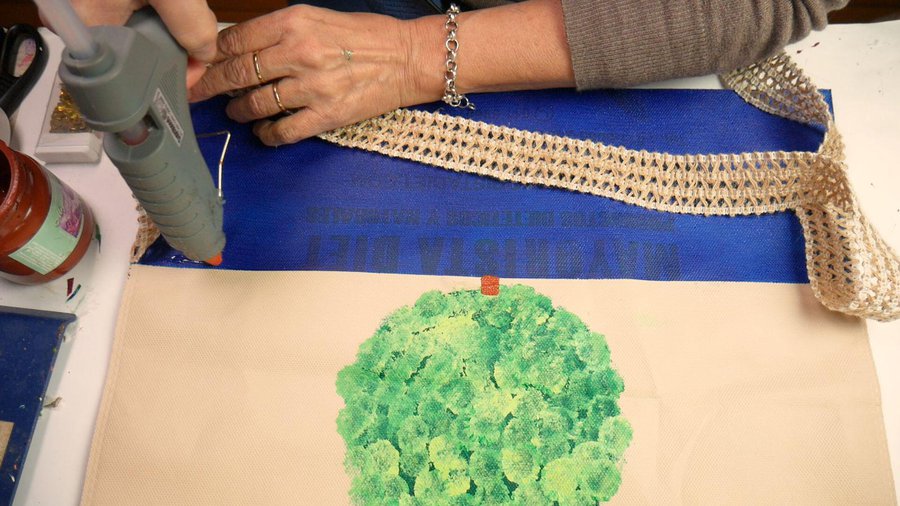 Mientras se seca aplico con pistola de calor una puntilla rústica sobre lo que sería la maceta. Para cubrir toda esa zona coloco 2 hileras de puntilla.