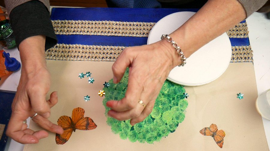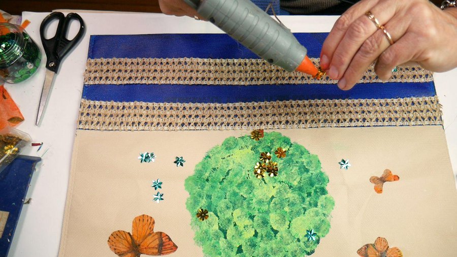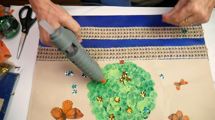 Por último sobre el árbol unas lentejuelas doradas en forma de flor que pego con la pistola caliente y unas con forma de estrellas azules alrededor de las mariposas.