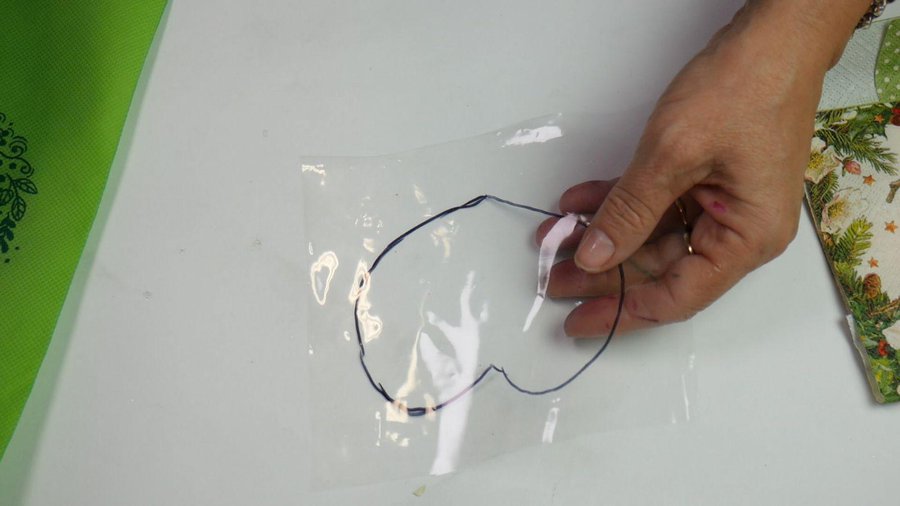 Con un trozo de plástico transparente marco el interior del corazón para saber por donde debo recortar la servilleta y que superficie cubrir con pintura acrílica blanca.