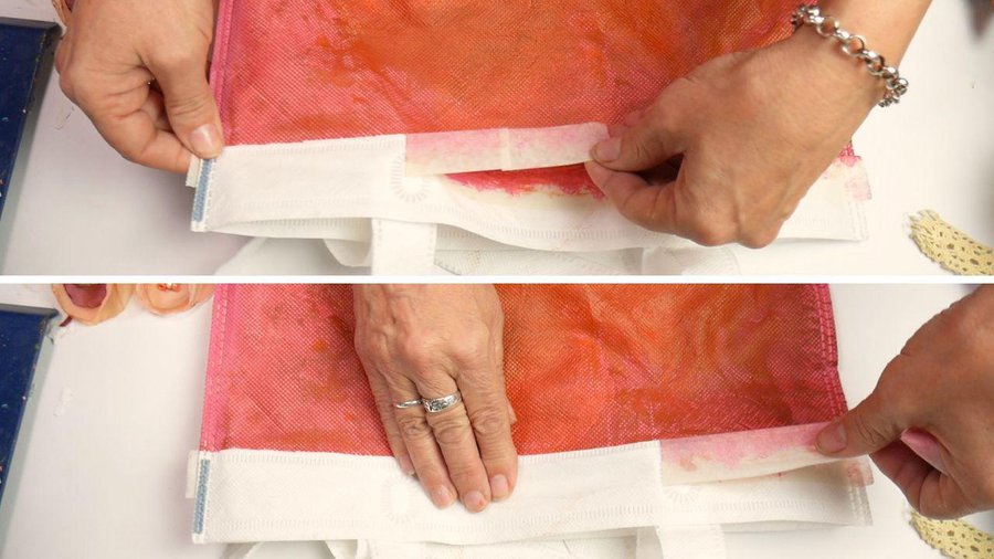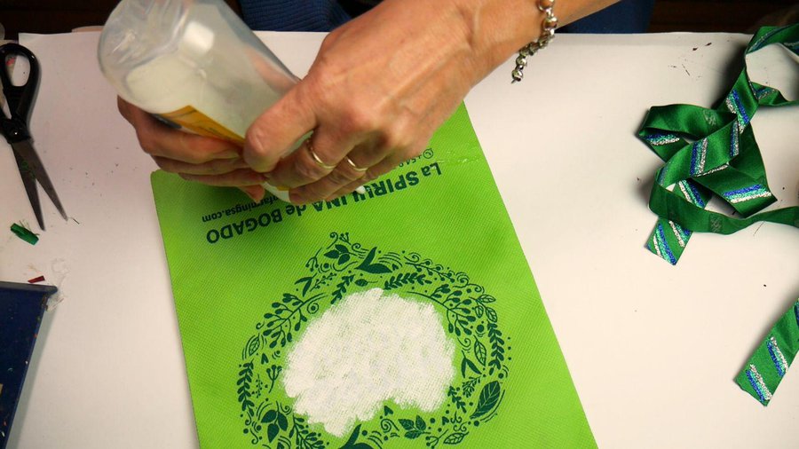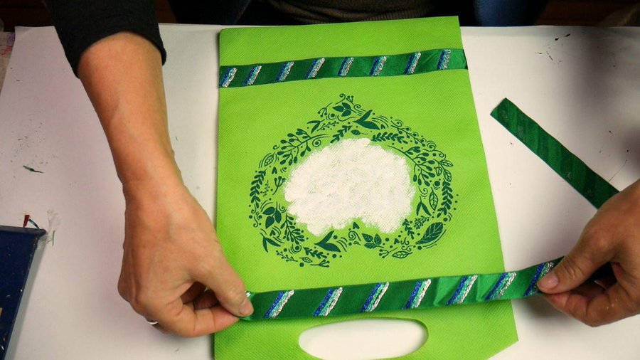La cinta la pego con pegamento de silicona para que no quede espesor, Color el pegamento a lo largo y pego la cinta, doy vuelta la bolsa y hago lo mismo del otro lado. Luego recorto el sobrante.