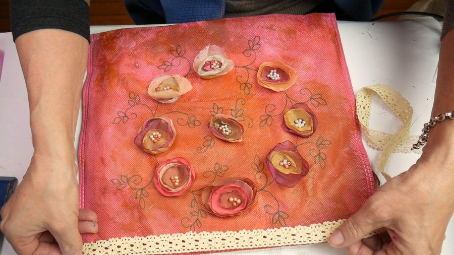 Pueden observar que las dos caras de la bolsa terminadas, una más elaborada y la otra más simple pero ambas hermosas y le dan un gran cambio a la bolsa primitiva, pudiéndole dar así otro uso.