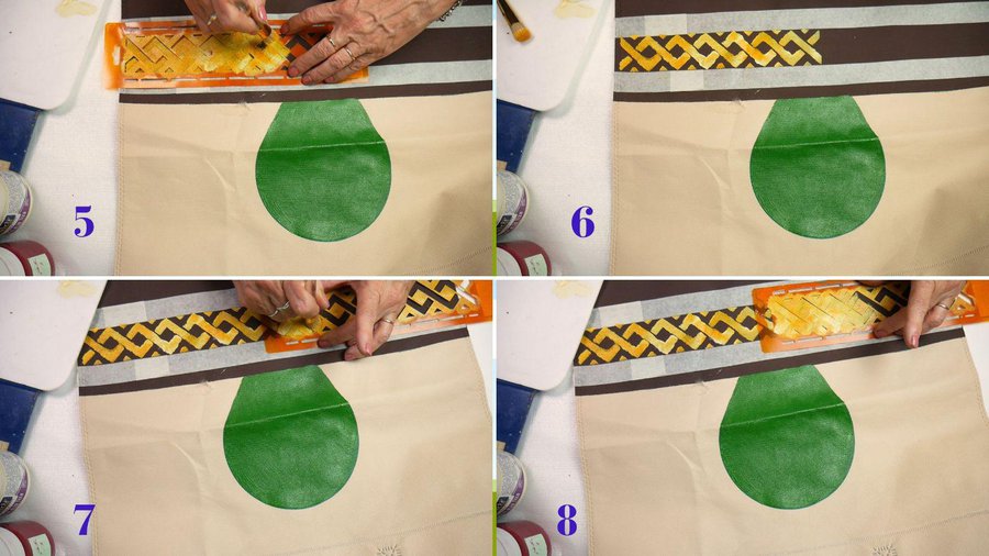 Mientras éste se seca sigo con la guarda de la maceta. Utilizo este stencil y amarillo oro y natural como pinturas acrílicas y con un pincel taponado voy aplicando la pintura por todo el stencil, lo voy trasladando ya que no alcanza el largo.