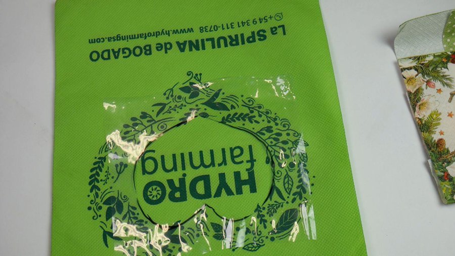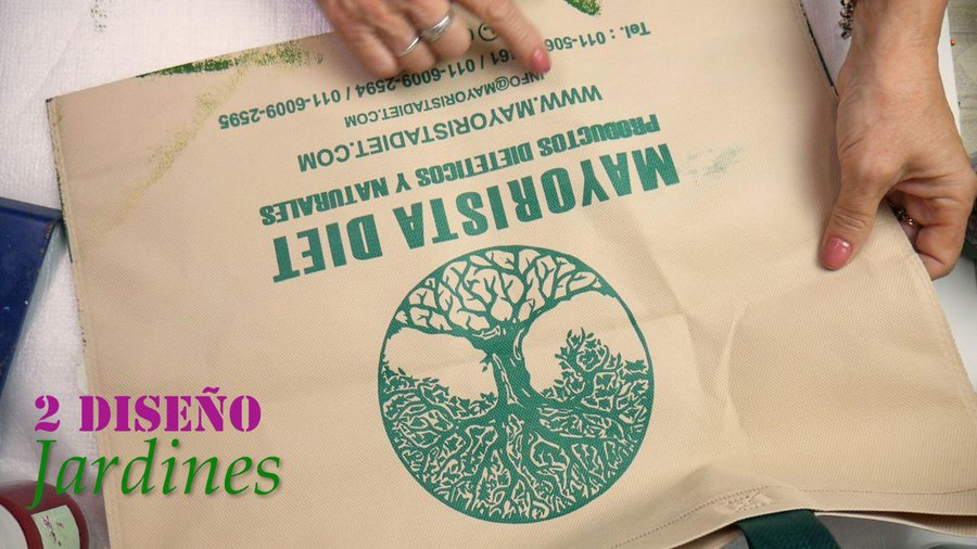 Trabajo ahora con una bolsa más grande, tiene este dibujo en círculo y este escrito.