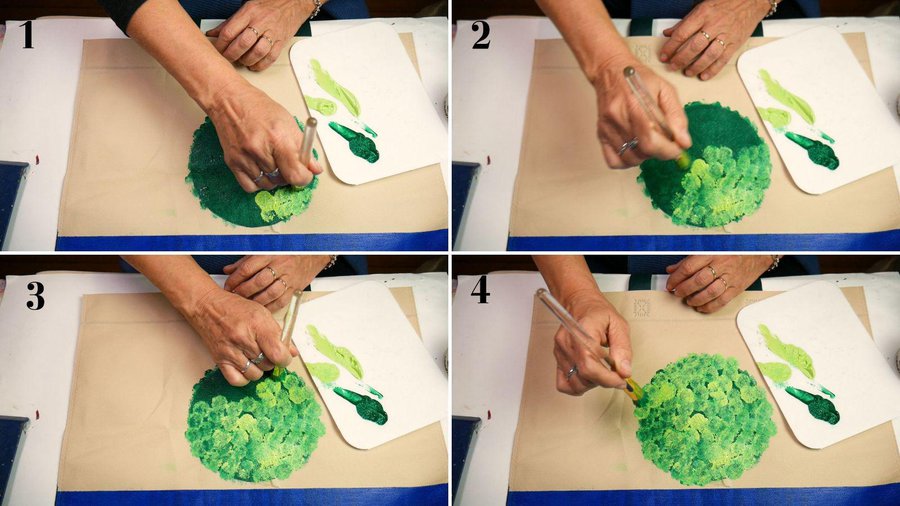Con un pincel taponado y la misma pintura verde oscuro a la que le sumo verde claro realizo golpecitos, mezclando las pinturas entre sí simulando ramilletes de hojas. Lo que quiero obtener es un arbolito con su follaje.