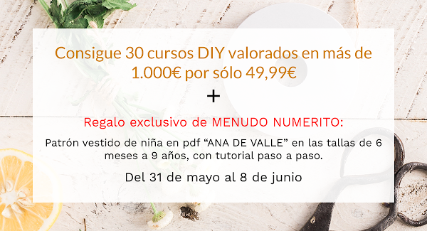 Quería recordarte que el próximo día 8 de junio acaba el plazo para adquirir el pack de 30 cursos DIY del que te hablé la semana pasada. Haz click en la siguiente foto para conocer todos los detalles, es una oportunidad única de aprender un montón de cosas bonitas.