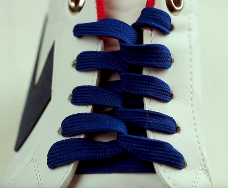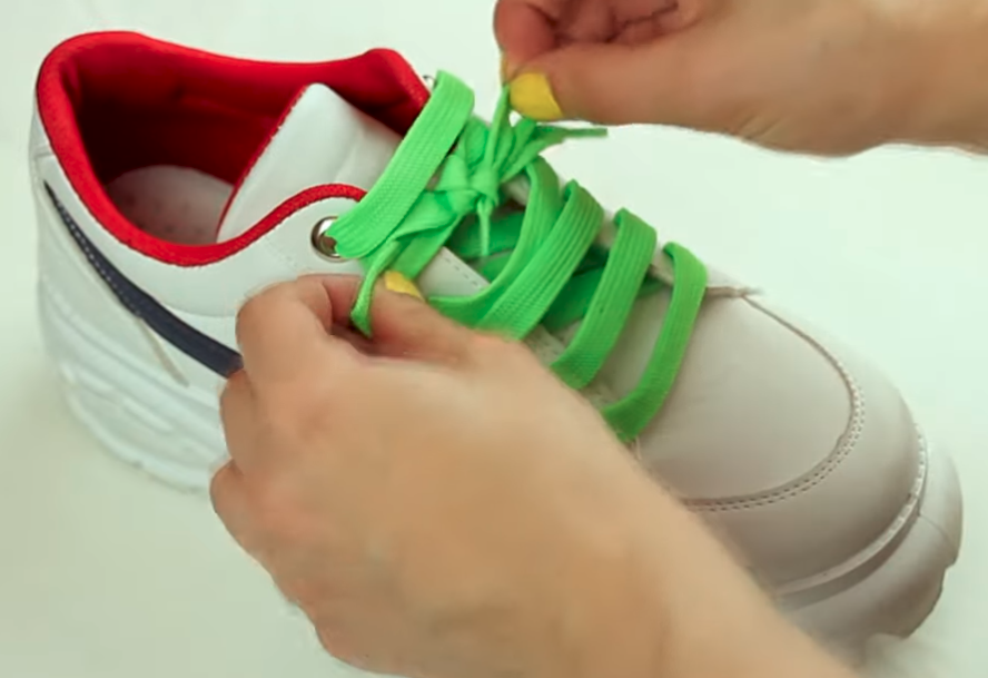 5. Tomamos el cordón más lejano y lo ponemos en el agujero correspondiente del lado derecho de fuera adentro, y en el anterior de dentro afuera. Hacemos un lazo, ¡y terminado!