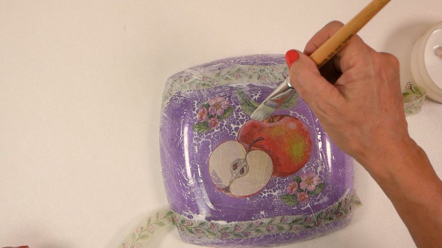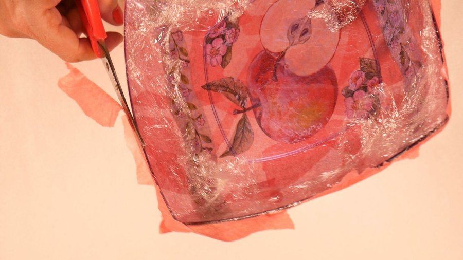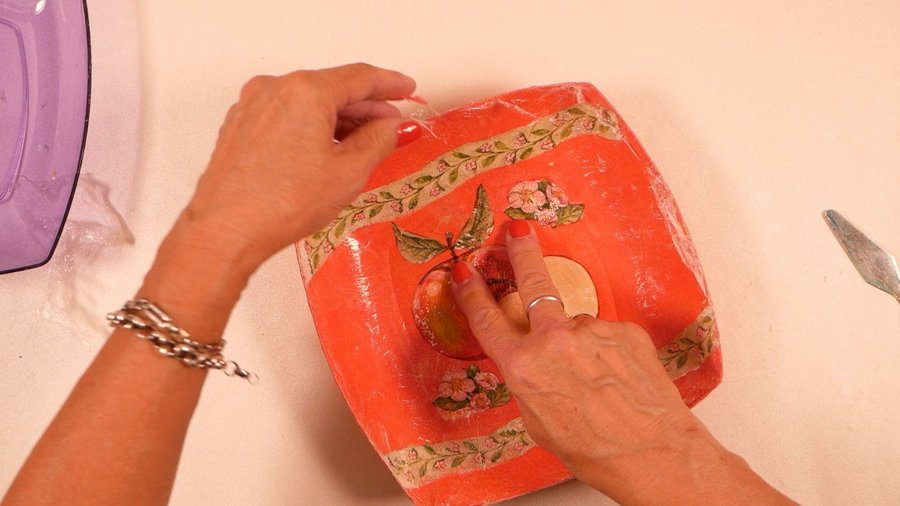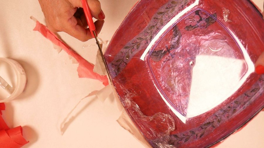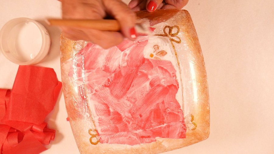 Como el plato es transparente pueden ver la imagen de la servilleta y los trozos del otro papel que se notan desparejos, por eso la segunda y tercera capa yo la realicé con el mismo papel ya que al ser un poco transparente tenía miedo de que se noten los trozos.