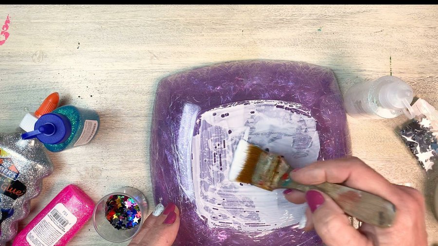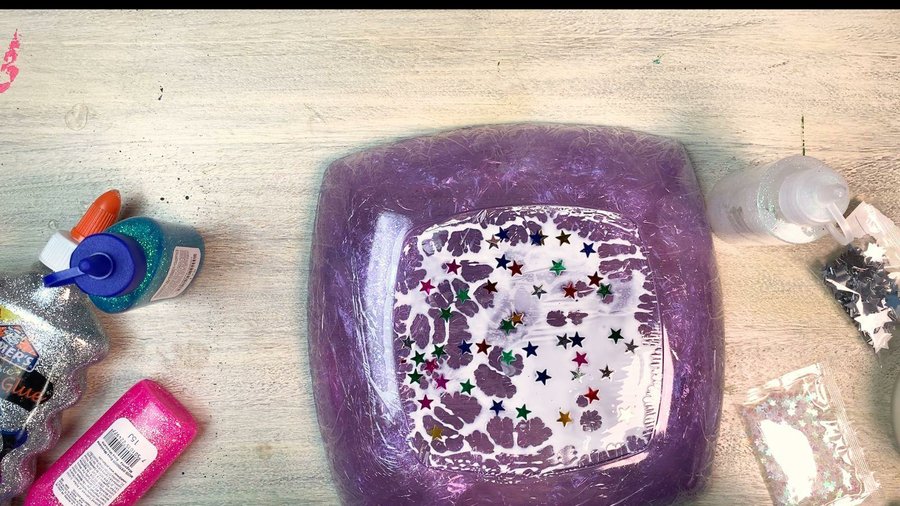 Ahora voy a mostrarles el que preparé con las estrellitas. En el plato las dos capas de film es igual para todos. Sobre el film coloque cola vinílica y tiré por encima estrellitas de plástico de colores que suelen usar para decorar uñas, y las deje pegarse de manera despareja.