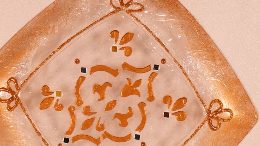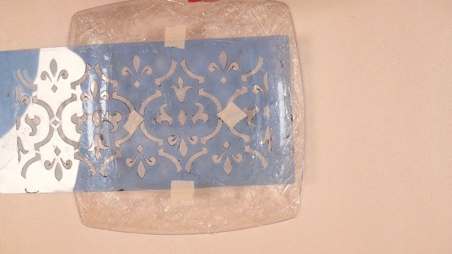Igual que en el plato anterior le pego guiándome por el dibujo unos cuadradillos planos de plástico de colores como aplicaciones para terminar de delinear el stencil.