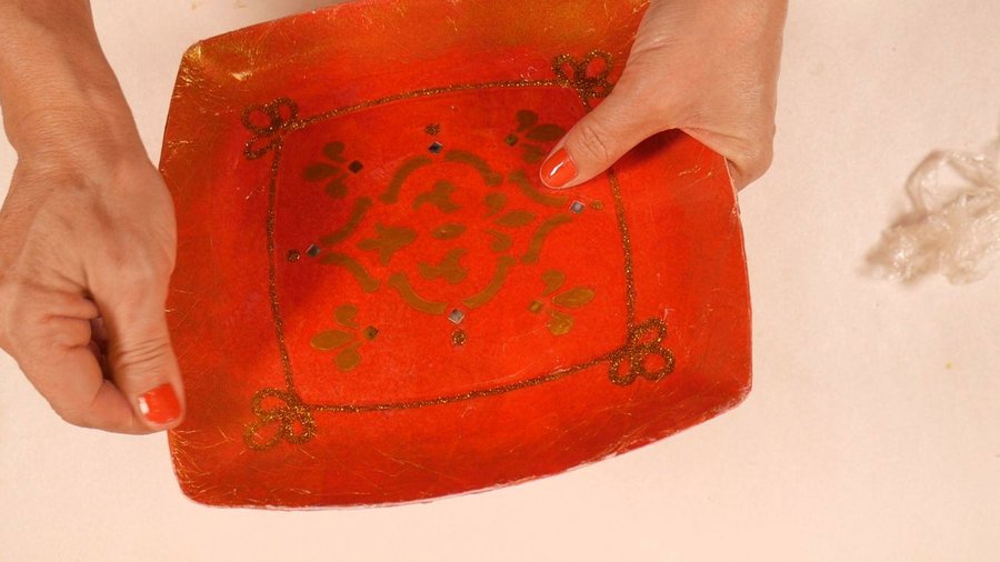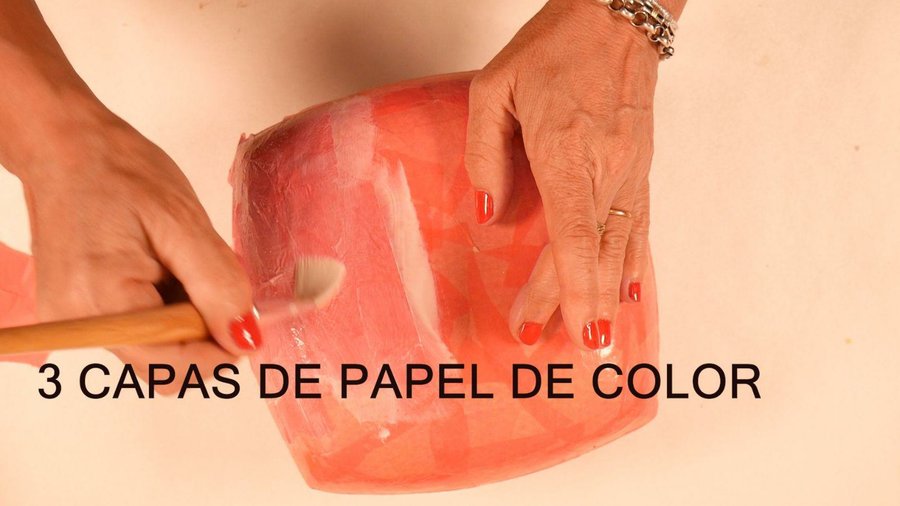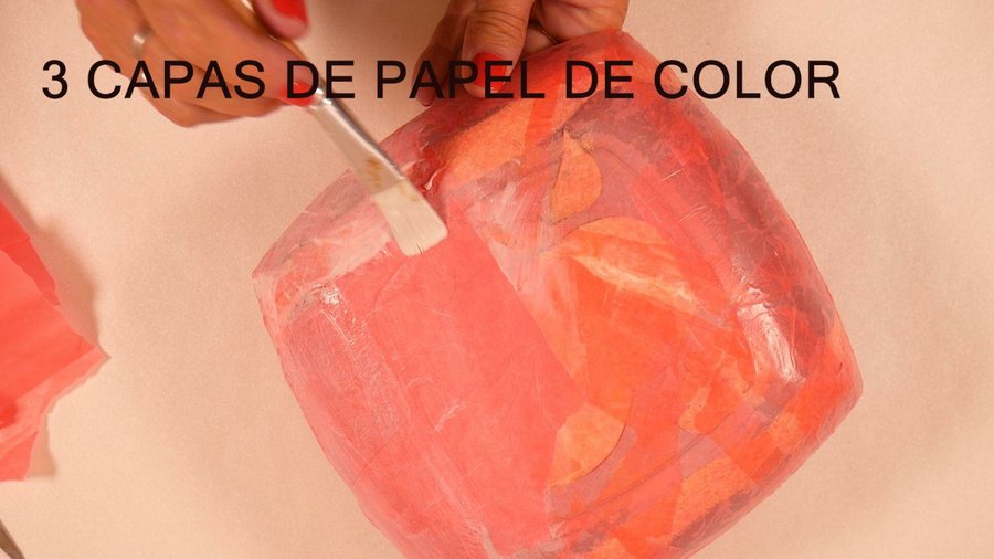 Y cuando todo se seco todas las capas de cartapesta que vimos, en éste último caso con papel de color rojo y el barnizado final.