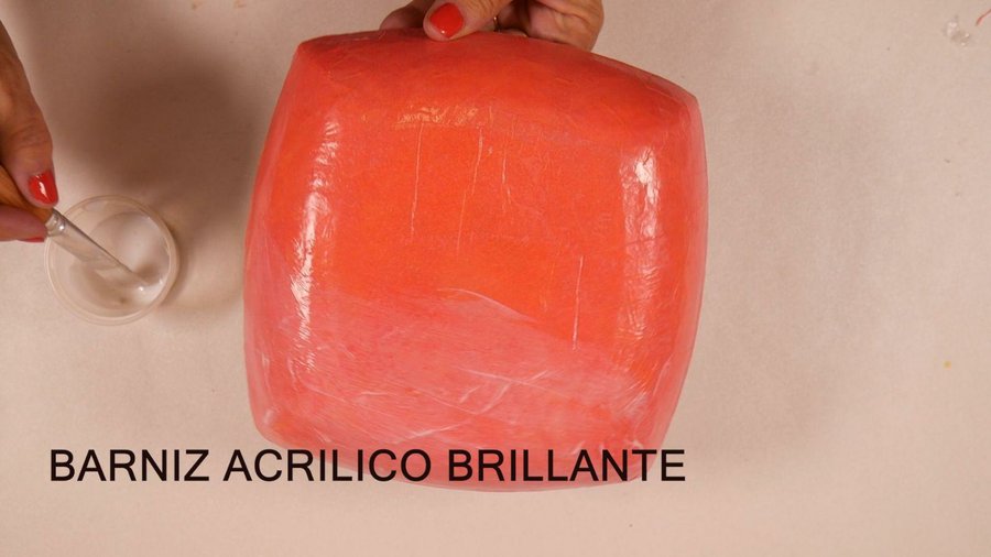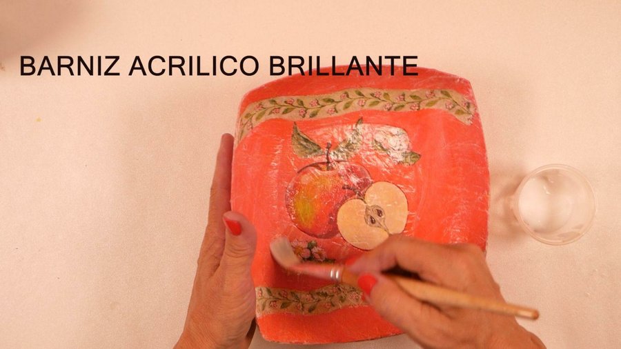 Una vez finalizado el brillo que observan corresponde a la cola vinílica pero esta no ofrece protección a la humedad por lo que es necesario darle 1 ó 2 manos de barniz acrílico brillante. Esto lo hago antes de desmoldar la pieza para mantener la forma ya que el barniz como es al agua puede ablandarla.