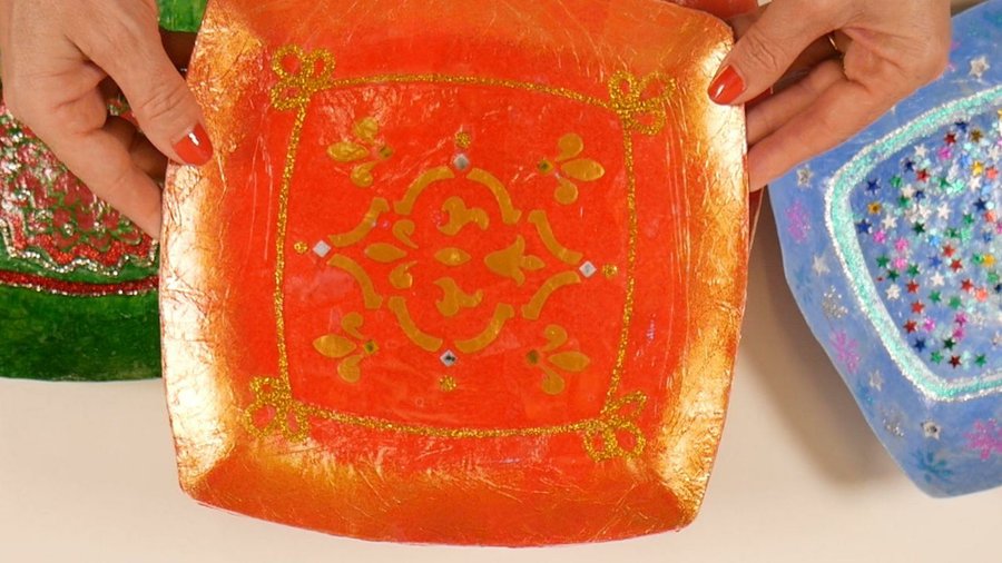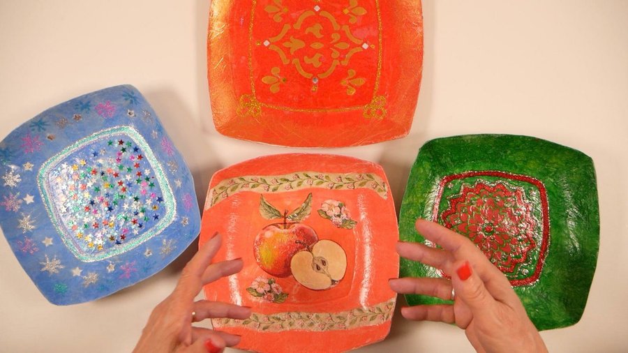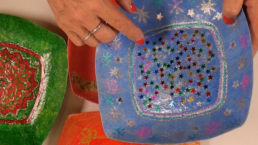 Esto significa que estas aplicaciones de estrellitas, glitter, servilletas, stencil se hacen con una preparación previa, o sea, no es que todos éstos dibujos y aplicaciones están sobre la cartapesta sino que la cartapesta se realiza encima de ellas.