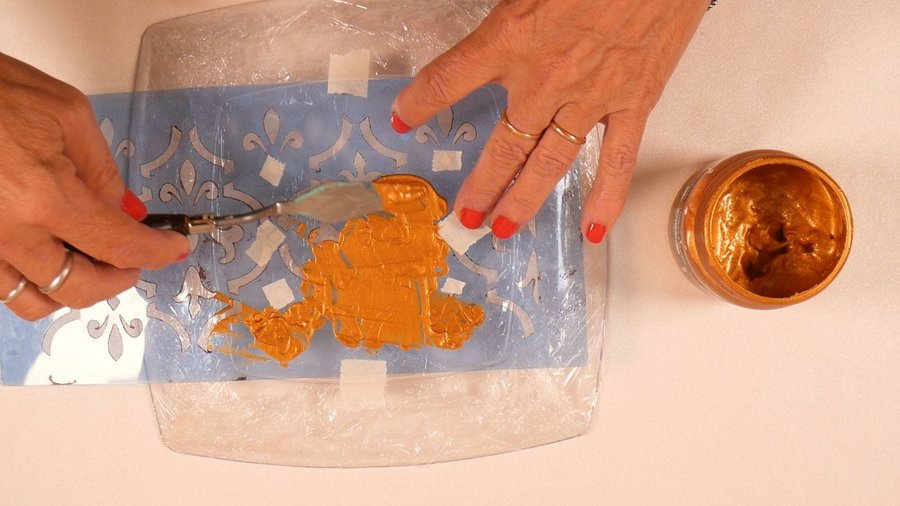 Luego coloco la pintura acrílica en éste caso dorada utilizando una espátula para que cubra bien, si ustedes quieren usar esponja o pincel taponado deberán dar por lo menos 2 manos de pintura para que cubra bien.