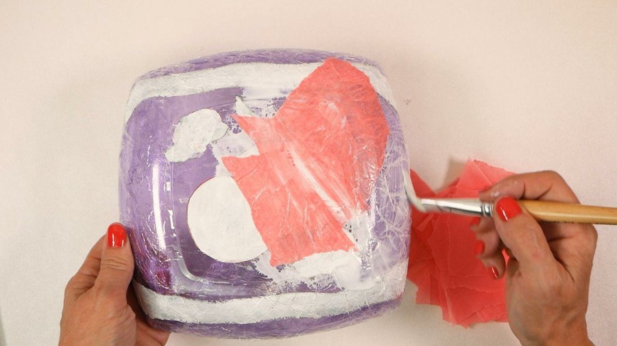 Lo corto en trozos como cualquier cartapesta y los voy pegando directamente sobre el film y sobre la servilleta pintada. Utilizaremos cola vinílica ya que necesito que quede transparente para que se vea el color del papel.