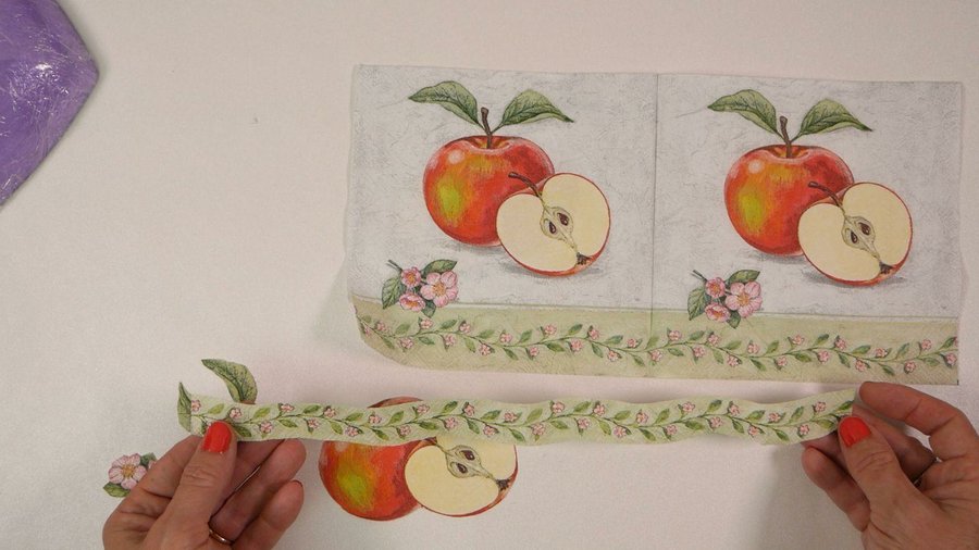 Para éste plato voy a pegarle un motivo que recorté de una servilleta. Recorté las manzanas y les separe el habito y las hojitas para que no se rompan y también recorté éstas flores y las guardas con forma de ondas.