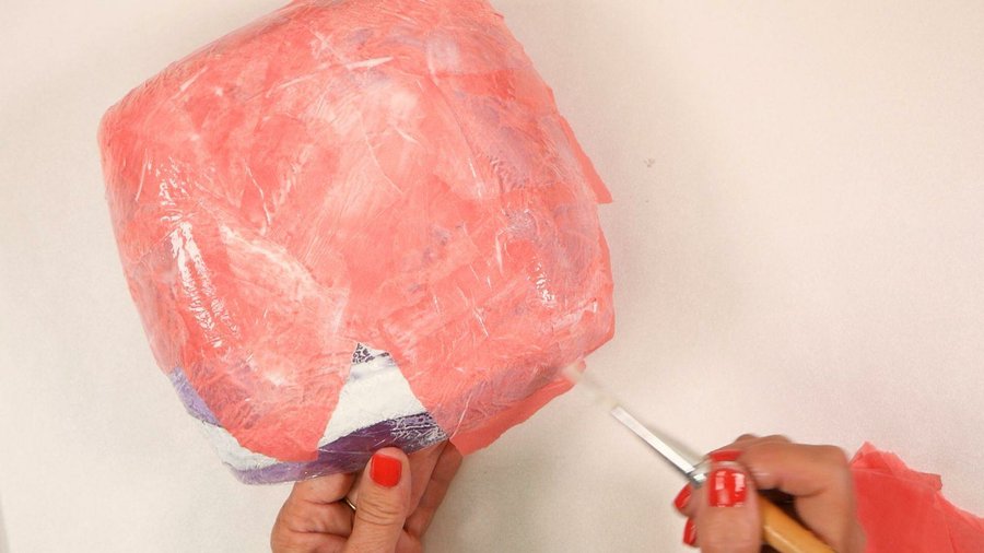 Ya está, se separó. Ahora retiro la capa más externa de film ya que la otra queda totalmente adherida a la primer capa de cartapesta y nos va a hacer también de protección.