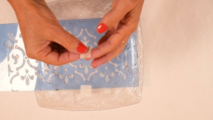2 capas de film adherente y sobre ésta ubico el stencil que lo sujeto con cinta de papel a la que le saque un poco de pegamento sobre mi piel para que no me rompa el film cuando la saque.