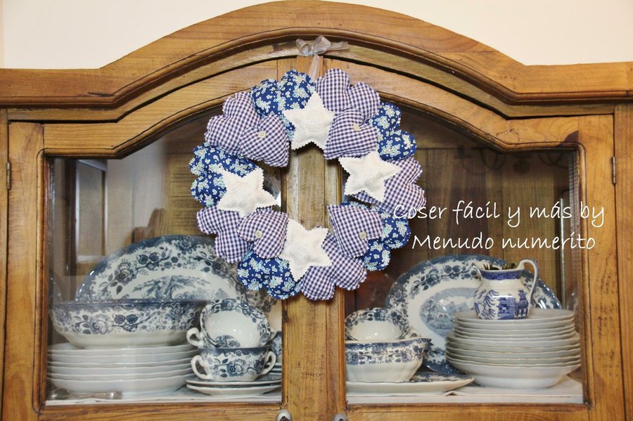 Si te gusta arriesgar con los colores y quieres salirte de los colores navideños más típicos puedes optar por esta corona en tonos azules. Como ves no necesitas tela de motivos navideños más que combinar teas en tonos azules e incluir algún detalle en plata o dorado que será el que le de el aire festivo a tu corona.