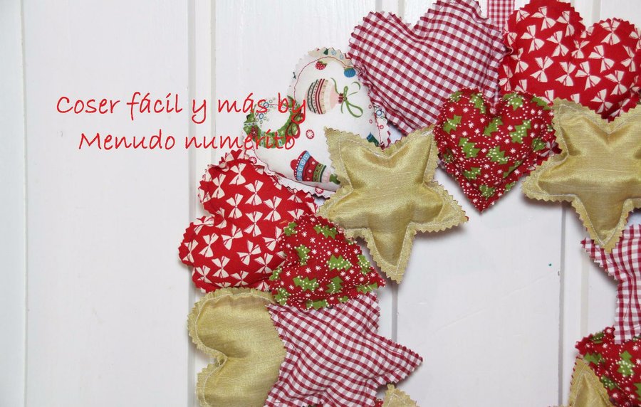 Aprovecha los trocitos de tela con tonos rojos que te sobran de otros proyectos de costura para hacer una corona navideña: restos de cuadritos vichy, telas de rallas, de topos, de puntitos... muchas de ellas te pueden servir para montar esta corona para la puerta de casa. En este caso sólo con añadir un detalle dorado ya lo tienes. Los materiales están descritos al inicio del post.