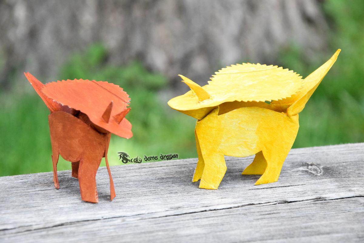 Triceratops Poseía una gran gola ósea (plataforma craneal posterior) y tres cuernos, un cuerpo grande sobre cuatro fornidas patas, y varias similitudes con respecto al moderno rinoceronte.