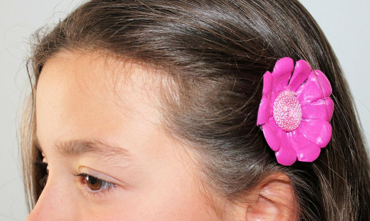 En ese caso hemos hecho una horquilla usando la parte de abajo de una botella que hemos coloreado de rosa con esmalte de uñas. En el centro de la flor hemos enrollado un cordón rosa.