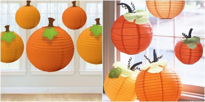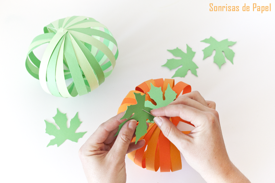 Colocar la hoja en una linterna de papel enrollando los extremos pegar gusanitos enrollados de limpia pipas. Para el tallo, colocar unas cuantas hojas de papel de periódico en una forma cónica; luego cortar la parte más ancha y luego envolver otro extremo con la cinta floral marrón. Envolver otro limpiador de tuberías marrón alrededor de la base del tallo y colgar las linternas con hilo de pescar.