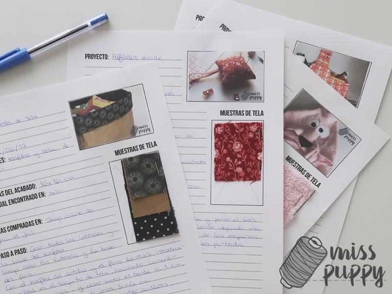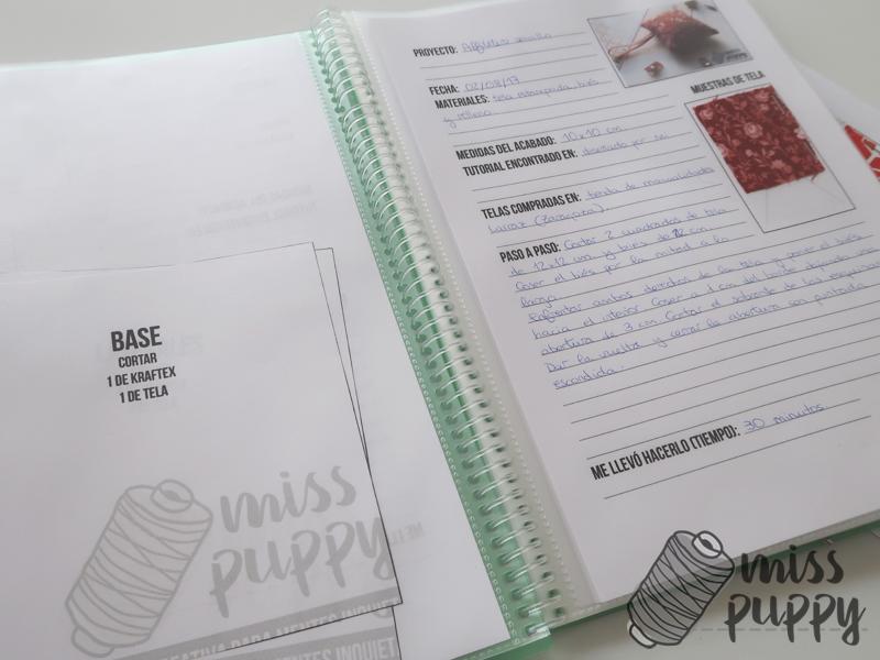 Preparé unas fichas super completas donde anoto todo lo necesario sobre cada cosa que hago: qué materiales usé, dónde compré las telas, el paso a paso… Hasta pongo una muestra de las telas que usé. Así, aunque algo se me olvide, si quiero volver a repetirlo, no tengo más que echar mano a mi carpeta. Ahí está, todo a mano y listo para volverlo a hacer.